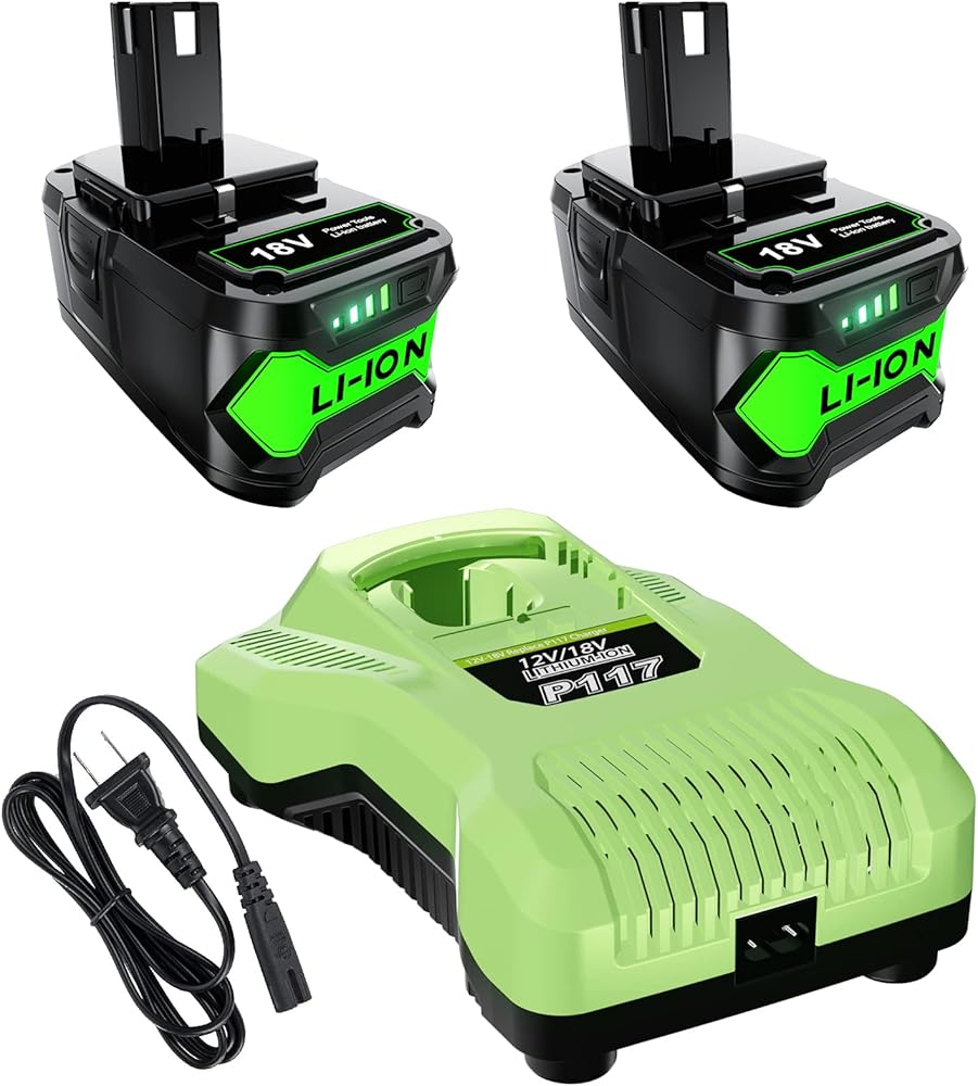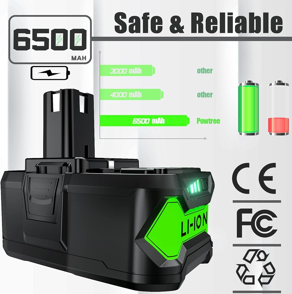 بطارية بديلة ليثيوم أيون 18 فولت 6500 مللي أمبير في الساعة من Powtree متوافقة مع Ryobi ONE+ P108 P102 P103 P104 P105 P107 P109 P122 أدوات الطاقة اللاسلكية (عبوتان) + مبدل