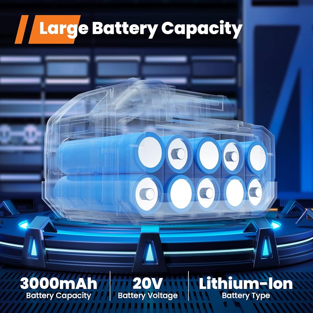 • 【مواصفات البطارية】جديدة تمامًا | السعة : 3000 مللي أمبير | نوع البطارية : ليثيوم أيون | الجهد: 20 فولت. قم بالترقية إلى سعة عالية تبلغ 3.0 أمبير/ساعة، أطول مرتين من وقت التشغيل القياسي البالغ 1.5 أمبير/ساعة، مما يمنح أدوات الطاقة اللاسلكية الخاصة بك العصير الذي تحتاجه لإنجاز المهمة.