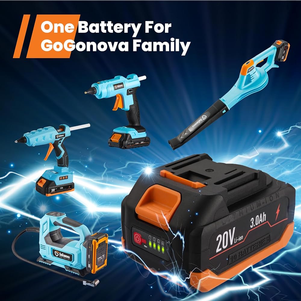 • 【توافق مثالي】متوافق مع Gogonova 20 Volt، الخط الكامل لأدوات الطاقة اللاسلكية ببطارية ليثيوم 20 فولت. مثل مسدس الغراء، وبخاخ الطلاء، ومنفاخ الأوراق، ومفتاح الربط، وبراد نيلر، وما إلى ذلك. ويعني نظام البطارية القابل للتبديل أنه يمكنك استخدام بطارية واحدة لعدة أدوات مختلفة.