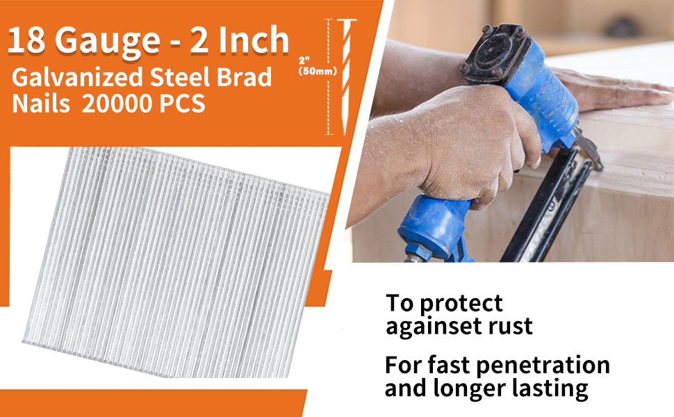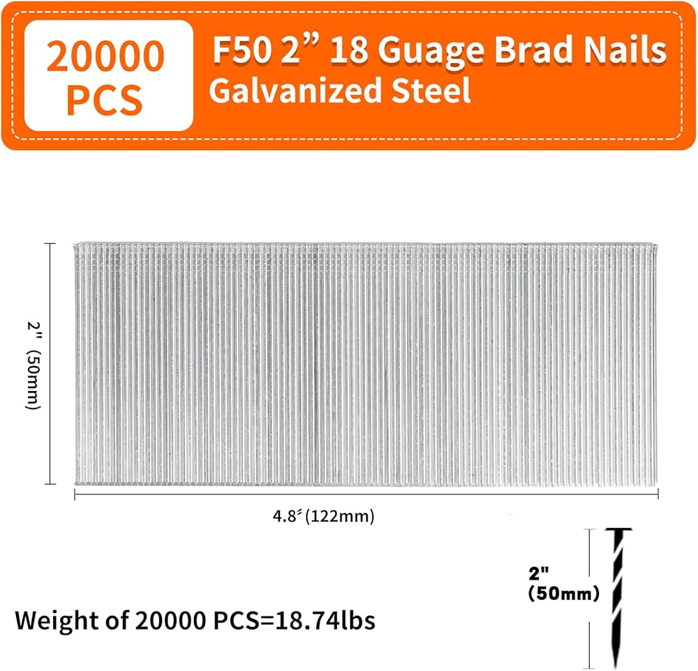 【Sufficient Quantity】The package includes 20000 Count F50 2” (50mm) 18ga brad nails. Don't let the fear of running out of nails dampen your efficiency! With our brad nails, no more interruptions or last-minute dashes to the store