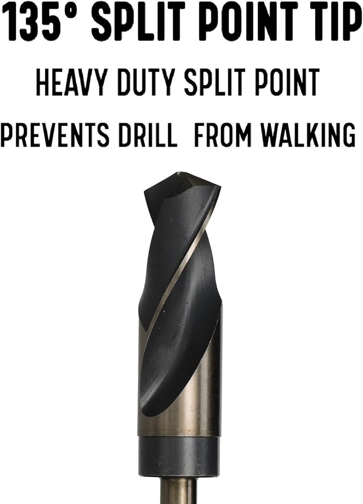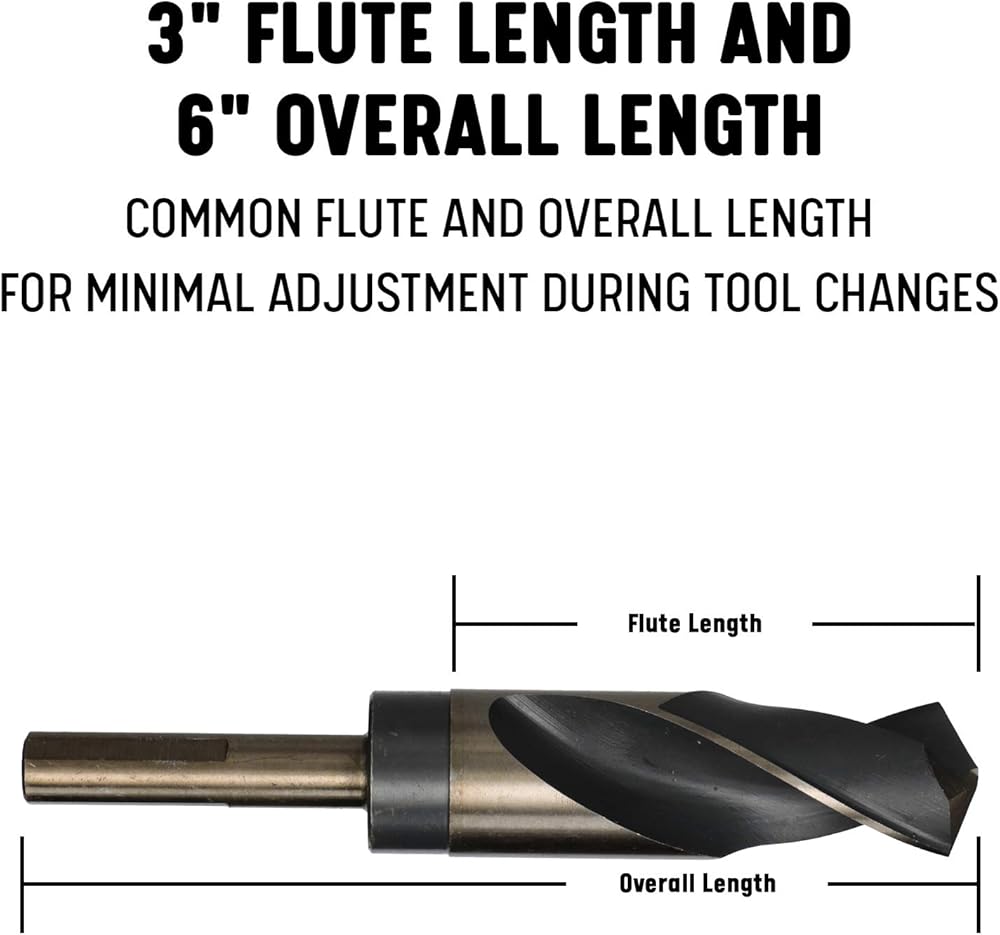 يتم تصنيع لقم الثقب ذات اللون الأسود والذهبي من شركة Drill America من الفولاذ عالي السرعة M1. تُستخدم هذه المثاقب في مجموعة واسعة من المواد في عائلات الحديد والصلب مثل الألومنيوم والحديد والصلب وغيرها من أدوات الحفر المعدنية. تحتوي على ساق ثلاثية مسطحة مما يخلق تثبيتًا آمنًا إضافيًا في ظرف الظرف الخاص بك. يساعد الطرف المقسم بمقدار 135 درجة في الحفر الدقيق. بالمقارنة مع الطرف التقليدي بزاوية 118 درجة، فإن هذه المثقاب لن "تسير" عليك. ساق منخفضة بمقدار 1/2 بوصة للاستخدام في مجموعة واسعة من أنظمة حمل الأدوات. الفلوت المشترك والطول الإجمالي للحد الأدنى من التعديل أثناء تغييرات الأداة. طول الناي 3 بوصات والطول الإجمالي 6 بوصات.