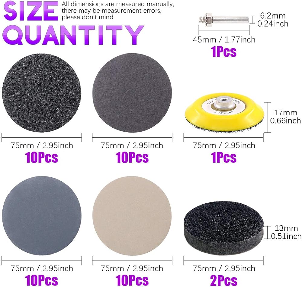 • ما تحصل عليه ----- في هذه المجموعة، قمنا بإعداد 40 قطعة 3 انش 75 ملم 4 أقراص صنفرة مختلفة للحبيبات الرطبة والجافة من أجلك. تتضمن 60 400 1500 5000 حبيبة، كل مقاس لـ 10 قطع. وفي الوقت نفسه، قمنا أيضًا بإعداد وسادة دعم للساق مقاس 1/4 انش ووسادة عازلة من الفوم الناعم، 43 قطعة، يمكن أن تلبي جميع احتياجاتك من منتجات الألبان.