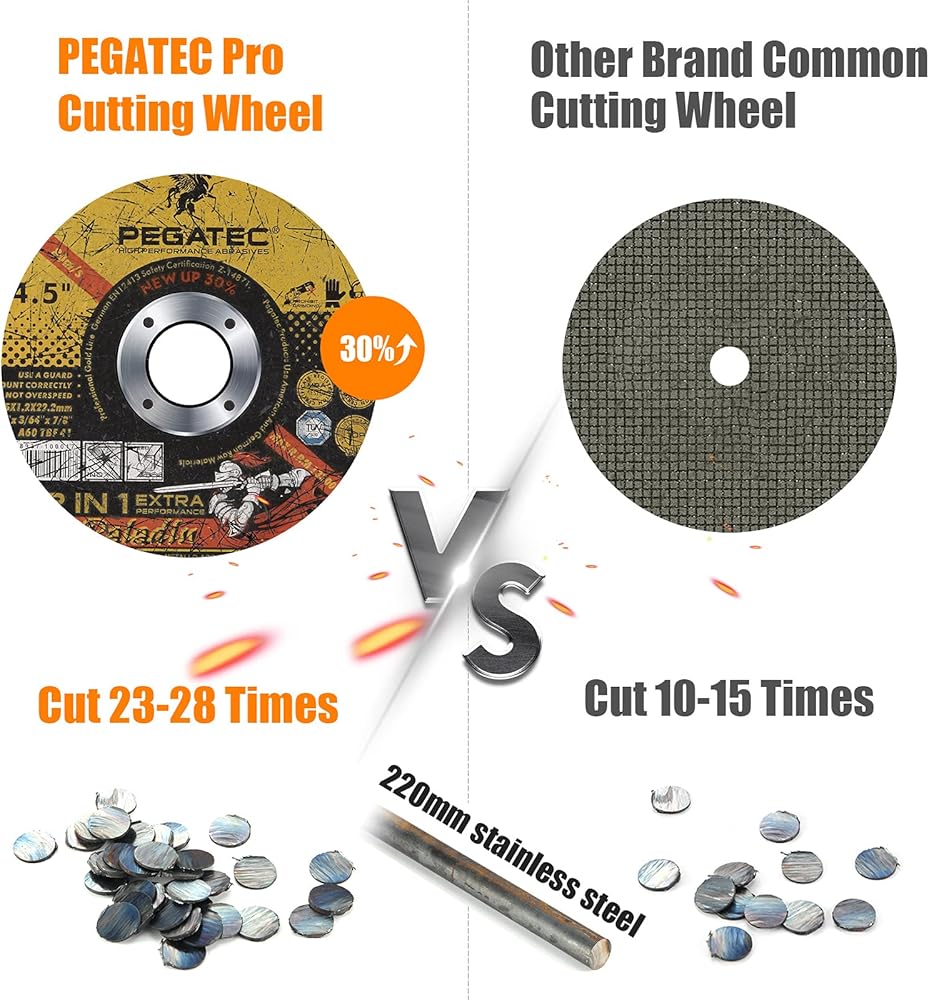 • تحسين الأداء بنسبة 30% - قضى فريق البحث والتطوير في PEGATEC ما يقرب من عام، حيث قام بمطابقة أكثر من 5000 وصفة، وأخيرًا وجد وصفة قطع يمكنها تحقيق أعلى أداء للقطع. تتميز أحدث عجلات القطع الاحترافية بأداء أعلى بنسبة 30%، وتعمل على أنابيب من الفولاذ المقاوم للصدأ مقاس 20 مم، ويمكنها القطع من 23 إلى 28 مرة، بينما يمكن لعجلات القطع العادية القطع من 10 إلى 15 مرة فقط.