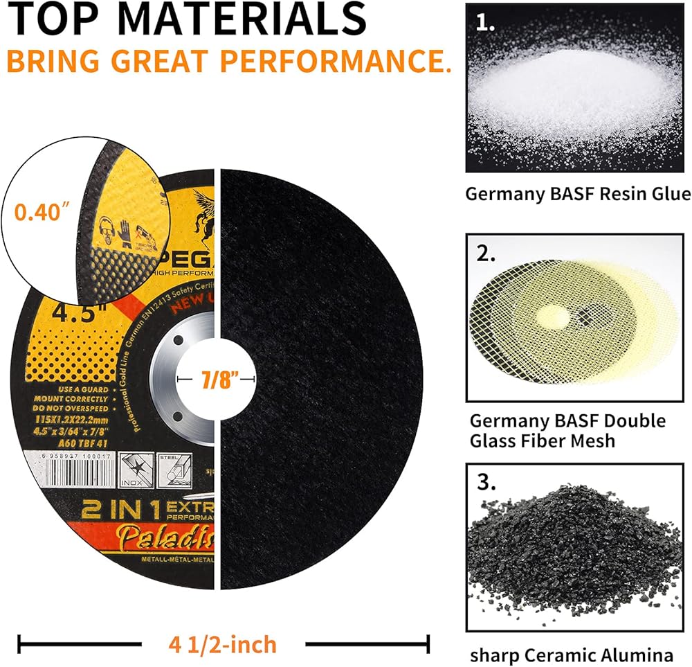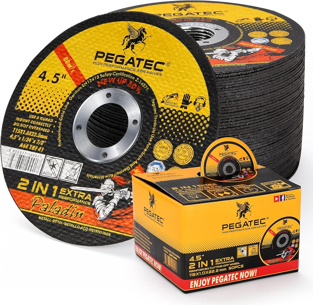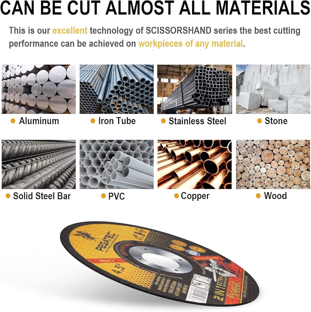 • نطاق قطع واسع - يبلغ قطر عجلات القطع ذات الزوايا الاحترافية PEGATEC 4.5 بوصة مع مركز معدني 7/8 بوصة وسمك 0.040 بوصة. قرص القطع الكاشطة الصلب مناسب جدًا للفولاذ الكربوني فائق السرعة وسبائك الألومنيوم والفولاذ المقاوم للصدأ والحديد والنحاس وجميع المعادن الأخرى.