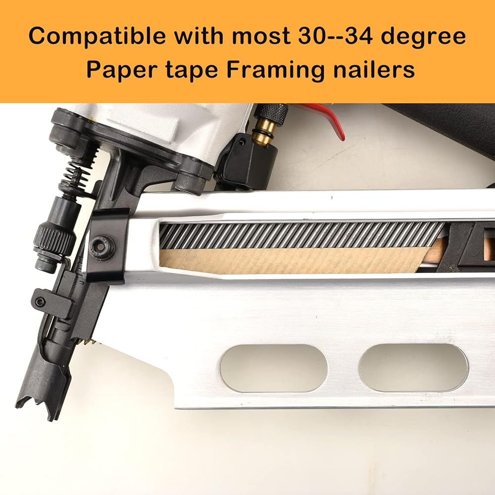 • متوافق مع معظم المسامير الورقية 30 إلى 34 درجة، بما في ذلك: بوستيتش، ديوالت، هيتاشي، ماكيتا، بالود، بورتر-كابل، ريدجيد، سينكو