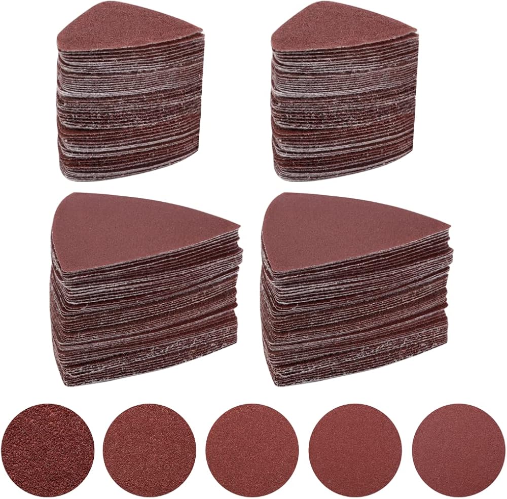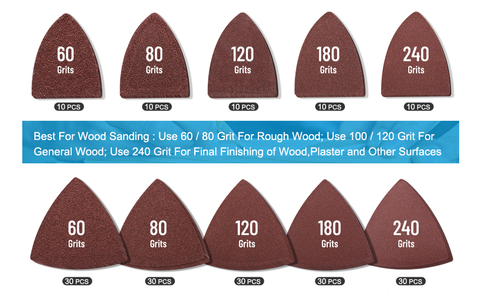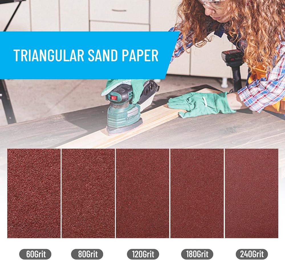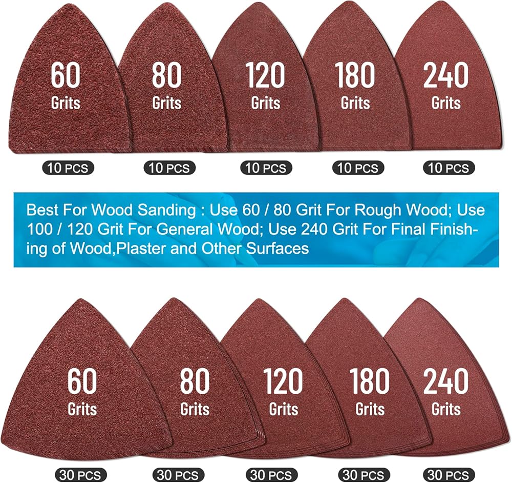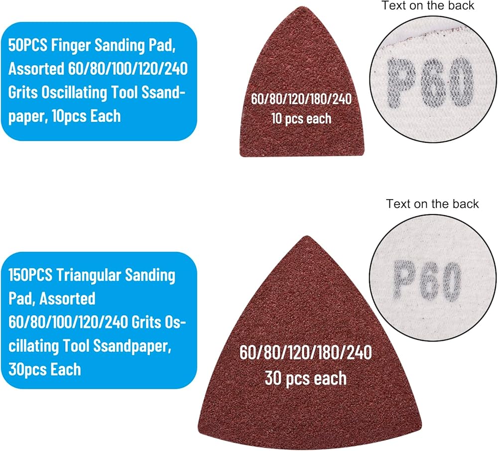 Package Detail: 200PCS Triangle Oscillating Multi Tool Sanding Pads contains 150Pcs 3-1/8 Inch Oscillating Tool Sandpaper for Triangle Mulool Sanding Pads 30pcs each, and 50PCS Finger Sandpaper 10pcs each,assorted 60/80/120/180/240 Grits