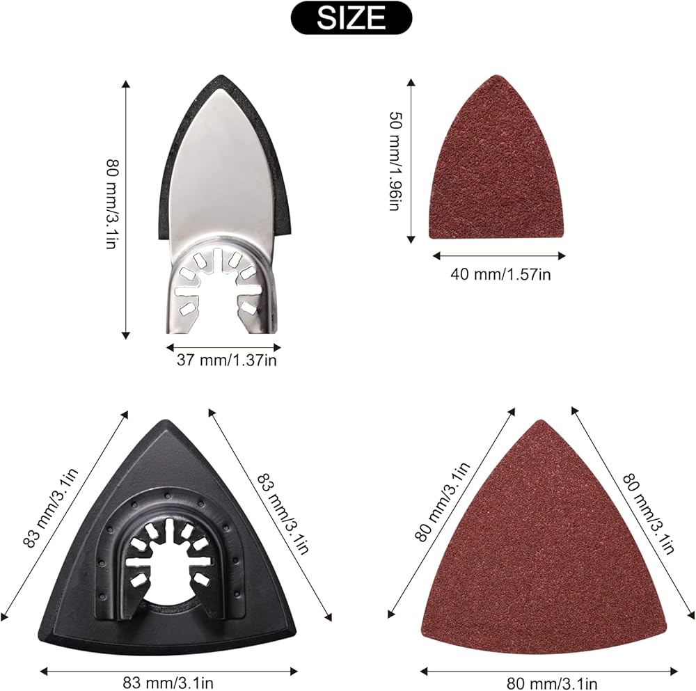 Wide Application: Oscillating tool sandpaper set made of high quality aluminium oxide abrasive, triangular hook and loop sand paper is durable, professional quality multi tool accessories.Perfect for sanding a wide variety of materials, such as wood, metal. plaster and other surfaces.