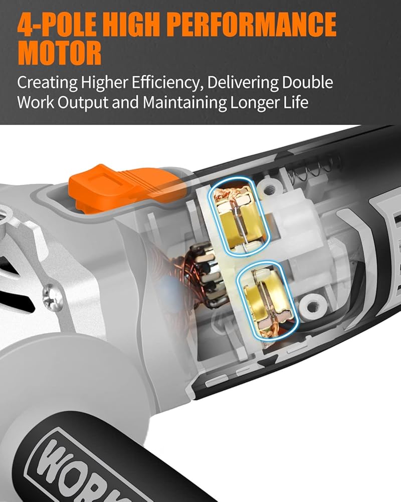 [قطع فعال] تخلق طاحونة WORKSITE ذات 4 أقطاب كفاءة أعلى وتوفر مخرجات عمل مزدوجة مقارنة بالمحرك العادي ذو القطبين، لتلبية مهام القطع والطحن الفعالة.
