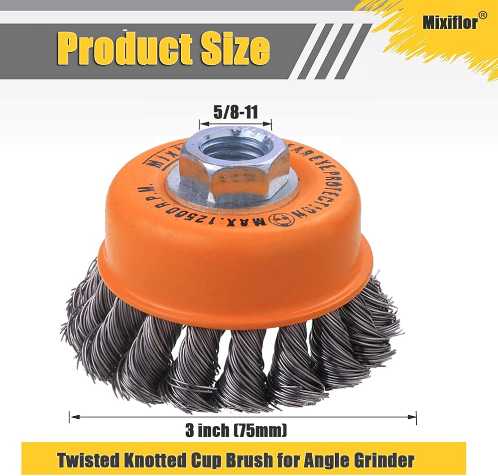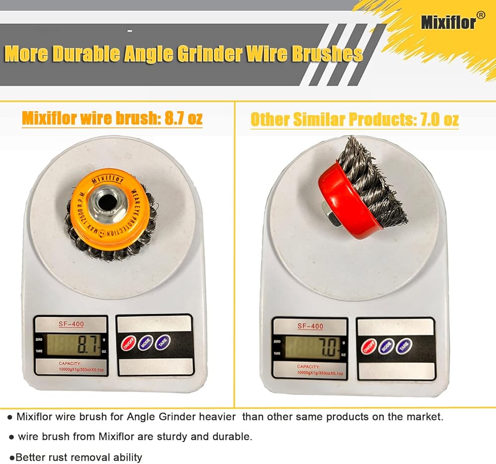 Advantages: The net weight of each wisted Knotted Cup Brush is 240 grams(about 8.7 ounces), heavier than other same products on the market, wire brush for angle grinder from Mixiflor are more sturdy and durable.