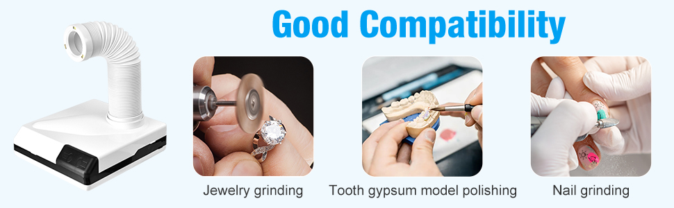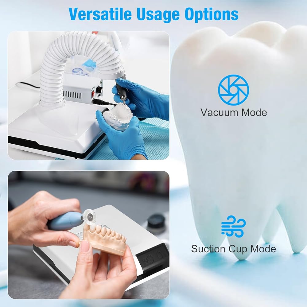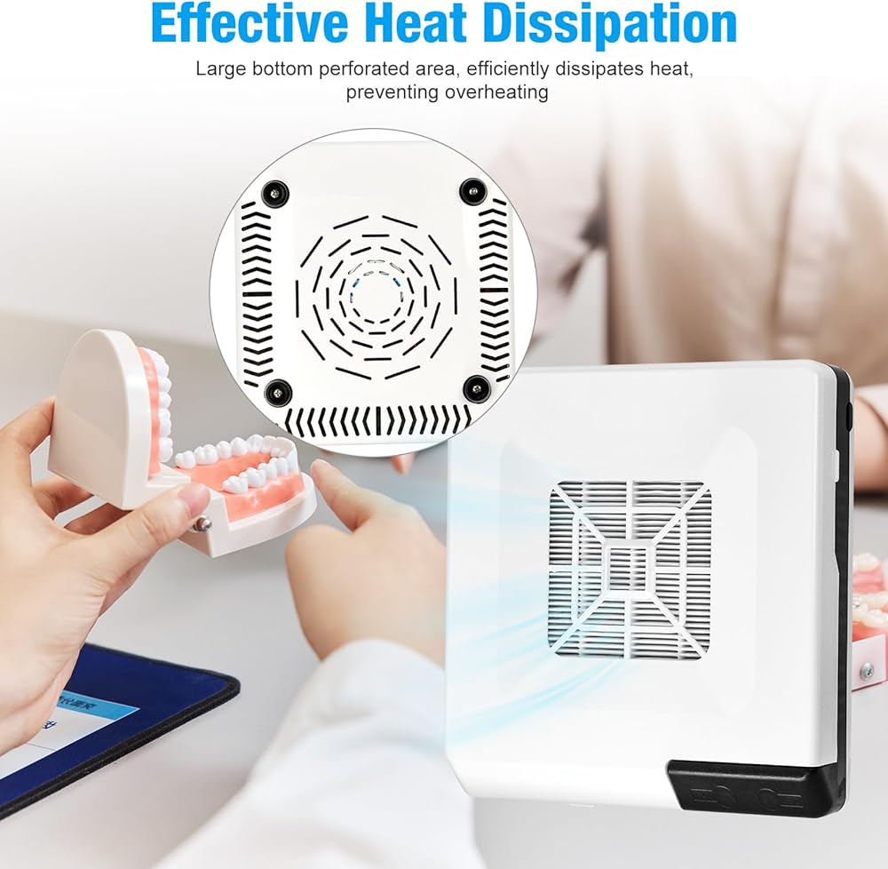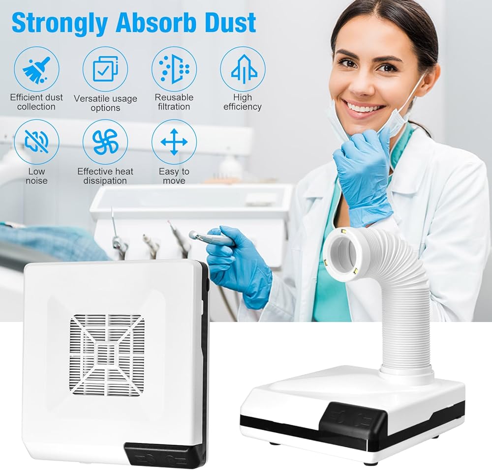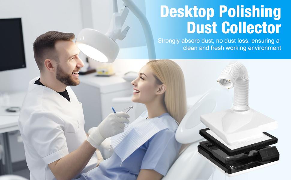 مجموعة فعالة من الغبار: يمكن لجهاز تجميع الغبار لتلميع سطح المكتب أن يلتقط بشكل فعال ويحتوي على الغبار المتولد أثناء مهام مثل تلميع نماذج جبس الأسنان وطحن الأظافر أو المجوهرات، وهو مجهز بمروحة شفط عالية الطاقة، يمتص الغبار بقوة، مما يضمن بيئة عمل نظيفة وجديدة.
