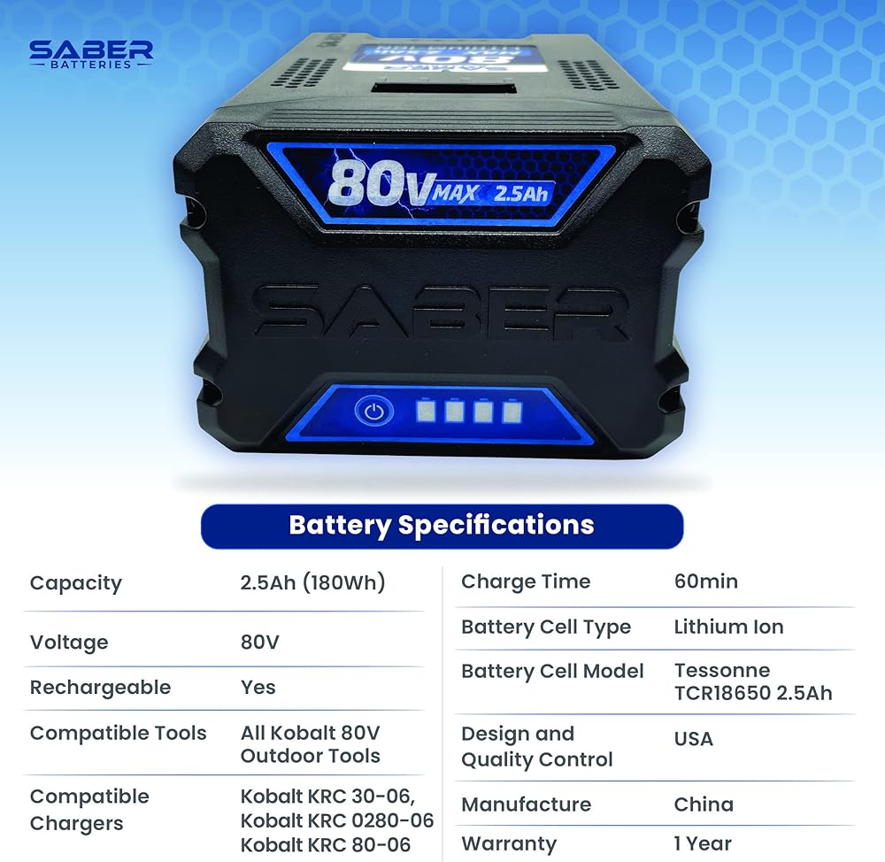 • متوافقة مع KOBALT: هذه البطارية متوافقة تمامًا مع مجموعة أدوات Kobalt 80 فولت بالكامل بما في ذلك جزازة Kobalt 80 فولت، ومنشار قطب Kobalt 80 فولت، ومنفاخ أوراق الشجر، وما إلى ذلك. ويمكن شحنها بشاحن Kobalt 80V الأصلي. استبدال جميع بطاريات Kobalt 80V (KB 2580C-06، KB 380-06، KB 680-06، KB 580-06)