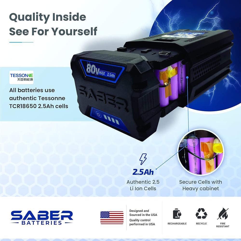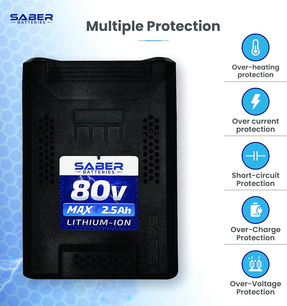 • حماية متعددة للسلامة: بطاريات سيبر 80 فولت بطارية ليثيوم أيون مزودة بشريحة دقيقة ذكية تمنع بشكل فعال ارتفاع درجة الحرارة والتيار الزائد والشحن الزائد وحماية الجهد الزائد من أجل السلامة والاستقرار.
