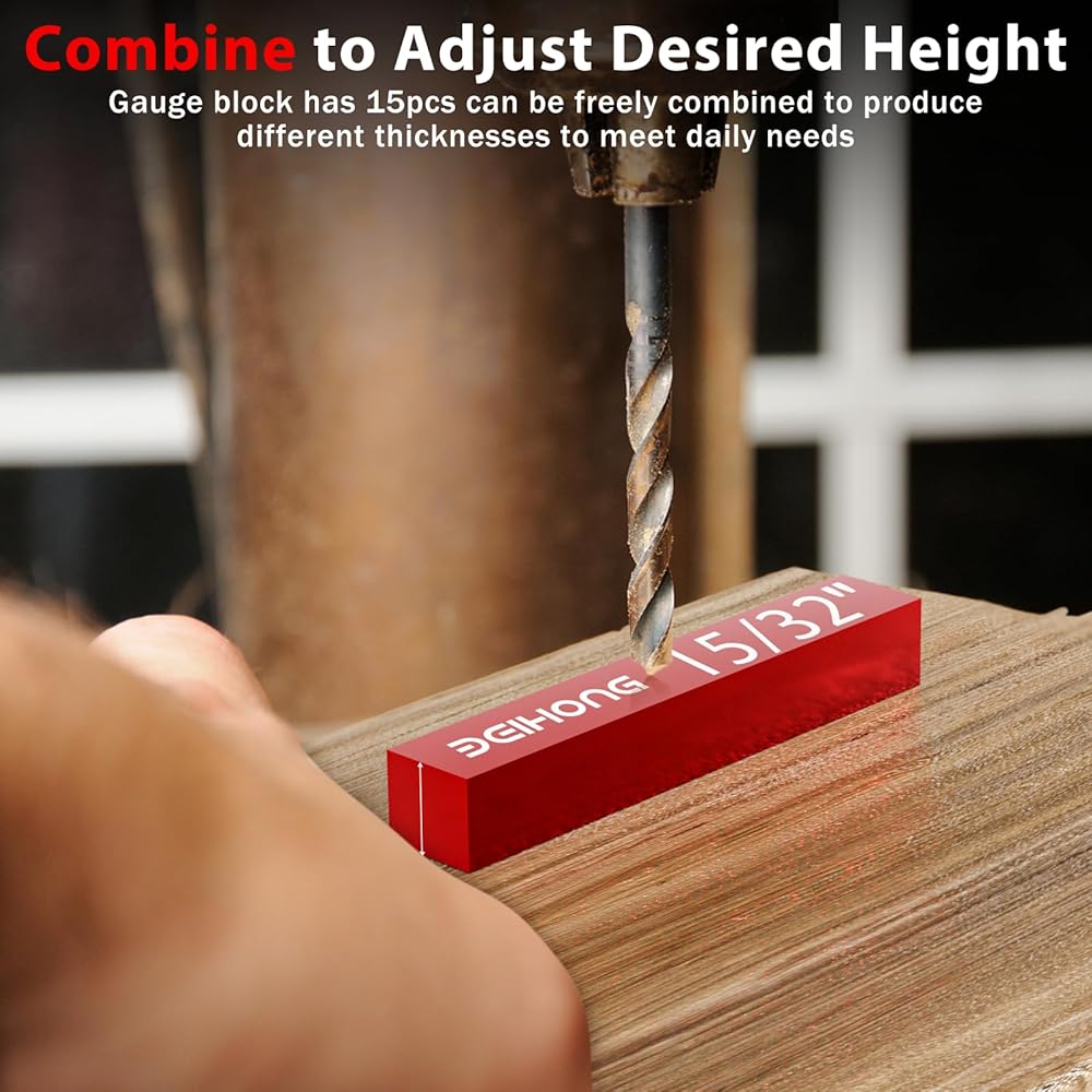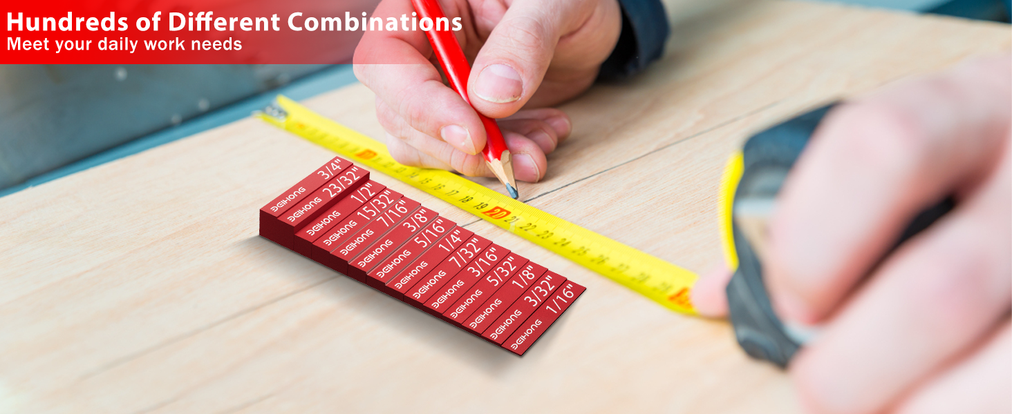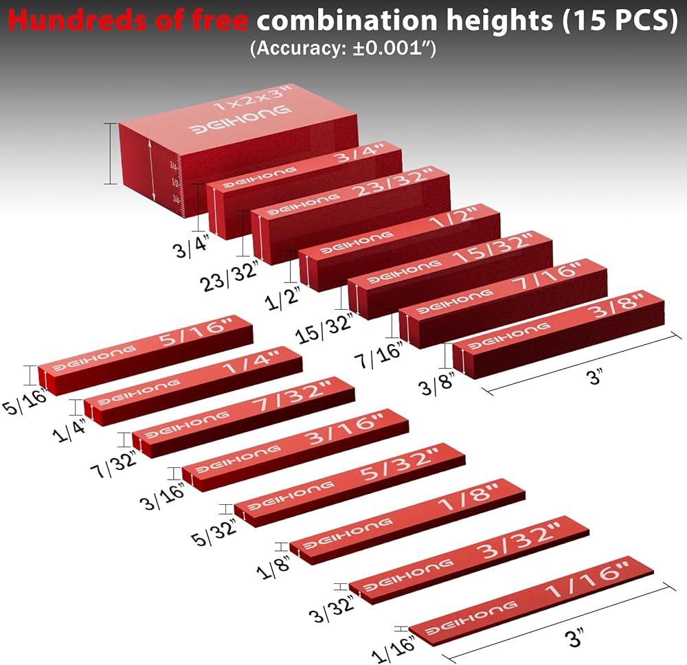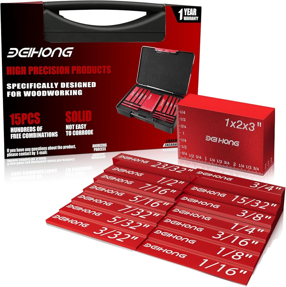 مجموعة عشوائية مكونة من 15 قطعة من مكعبات تركيب النجارة تحتوي على مئات المجموعات، مجموعة واحدة فقط من مكعبات الإعداد تلبي احتياجات معظم أعمال النجارة. يسمح لك كل مقاس بأخذ أي قياس من 1/16 انش إلى 1 انش بزيادات 1/32 انش. إذا كنت تستخدم جميع مكعبات التركيب معًا، يمكنك تمديد نطاق القياس حتى 6-1/4 انش.