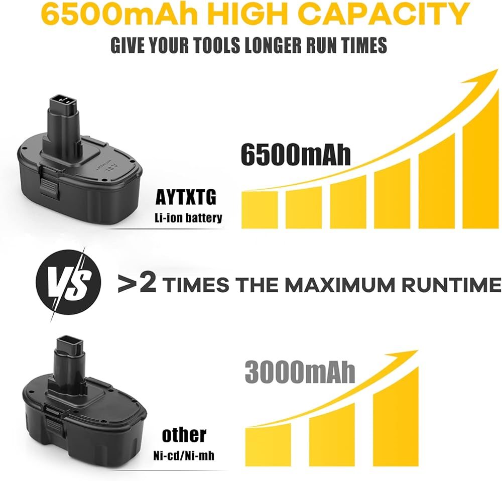 [𝑷𝒓𝒐𝒅𝒖𝒄𝒕 𝒃𝒂𝒔𝒊𝒄 𝒊𝒏𝒇𝒐𝒓𝒎𝒂𝒕𝒊𝒐𝒏]- نوع البطارية: ليثيوم أيون، الجهد: 18 فولت، السعة: 6500 مللي أمبير، نوع الشاحن :DC9310; قابس التيار المتردد: دبوس مسطح من النوع الأمريكي. طول الكابل 59 بوصة (1.5 متر)