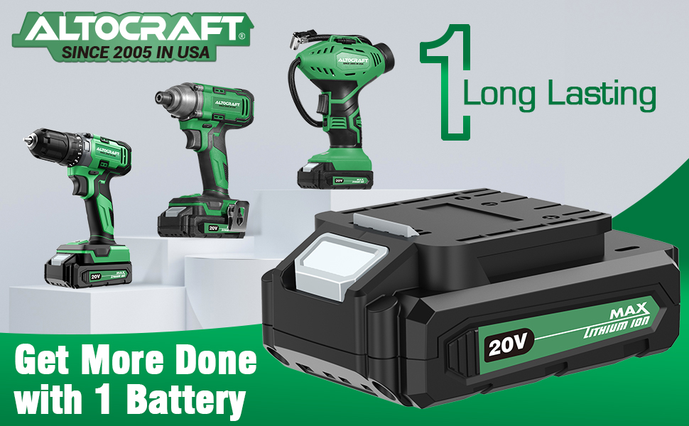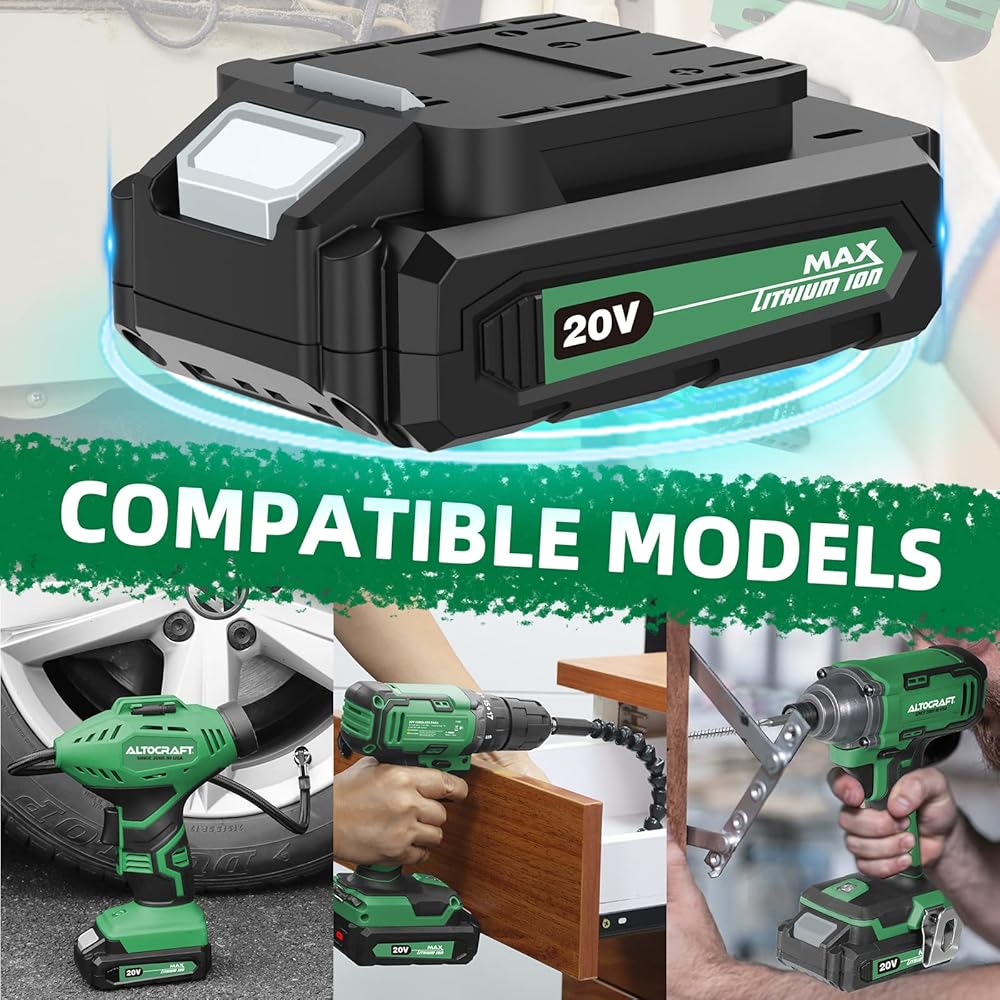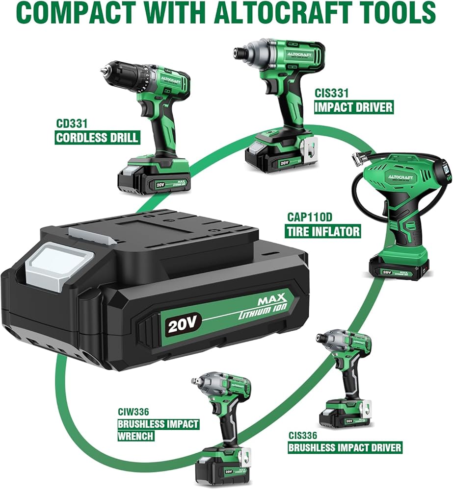 • ✅متوافق مع المثقاب اللاسلكي ALTOCRAFT 20V CD331، ومحرك الصدمات اللاسلكي CIS331 ومنفاخ الإطارات اللاسلكي المزدوج الطاقة CAP110D. مناسب أيضًا لمحرك الصدمات بدون فرش ALTOCRAFT CIS336 ومفتاح الربط بدون فرش CIW336.