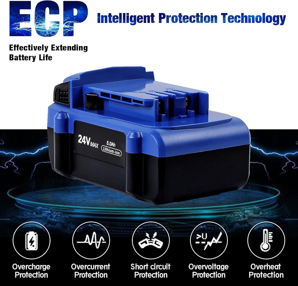 • 🔋 【مواصفات البطارية 】 النوع : ليثيوم أيون | الجهد: 24 فولت | السعة: 5000 مللي أمبير | واط: 120 واط | العبوة: عبوة واحدة، توفر ما يصل إلى 3.5X وقت تشغيل مقارنة ببطارية Kobalt 24V.
