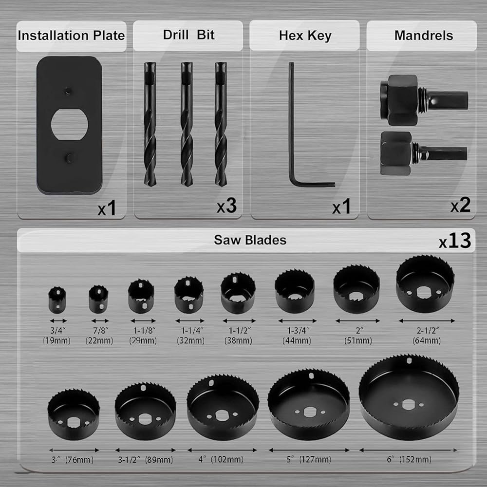 • 【تتضمن العبوة 20 قطعة】 تتضمن مجموعة منشار ثقب كاتا 13 قطعة من شفرات المنشار، 3/4 بوصة (19 مم)، 7/8 بوصة (22 مم)، 1-1/8 بوصة (29 مم)، 1-1/4 بوصة (32 مم)، 1-1/2 بوصة (38 مم)، 1-3/4 بوصة (44 مم)، 2 بوصة (51 مم)، 2-1/2 بوصة (64 مم)، 3 بوصة (76 مم)، 3-1/2 بوصة (89 مم) )، 4 بوصة (102 مم)، 5 بوصة (127 مم)، 6 بوصة (152 مم)، 2 شياكة، 3 رؤوس مثقاب، 1 مفتاح سداسي، 1 لوحة تركيب.