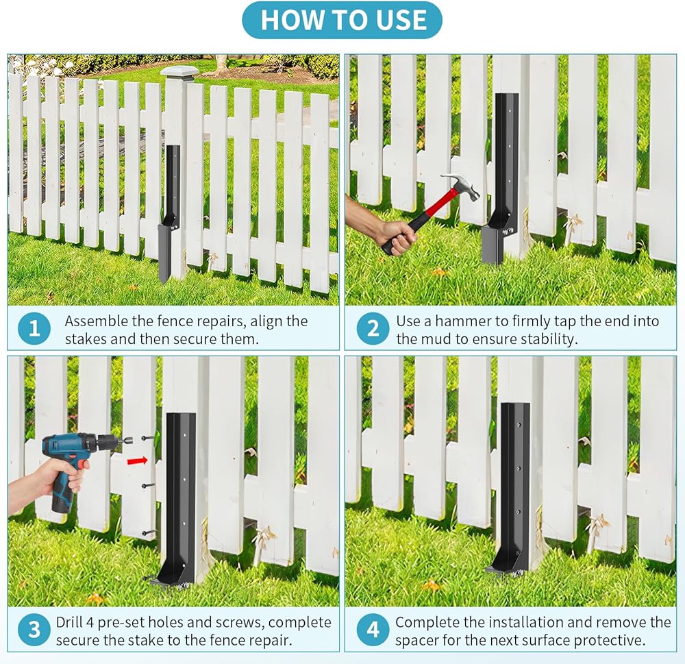• تركيب بسيط: 1. قم بتجميع إصلاحات السياج، ومحاذاة الأوتاد ثم تأمينها. 2. استخدم مطرقة للنقر بقوة على النهاية في الطين لضمان الثبات. 3. قم بثقب 4 فتحات ومسامير محددة مسبقًا، وقم بتأمين الحصة لإصلاح السياج.