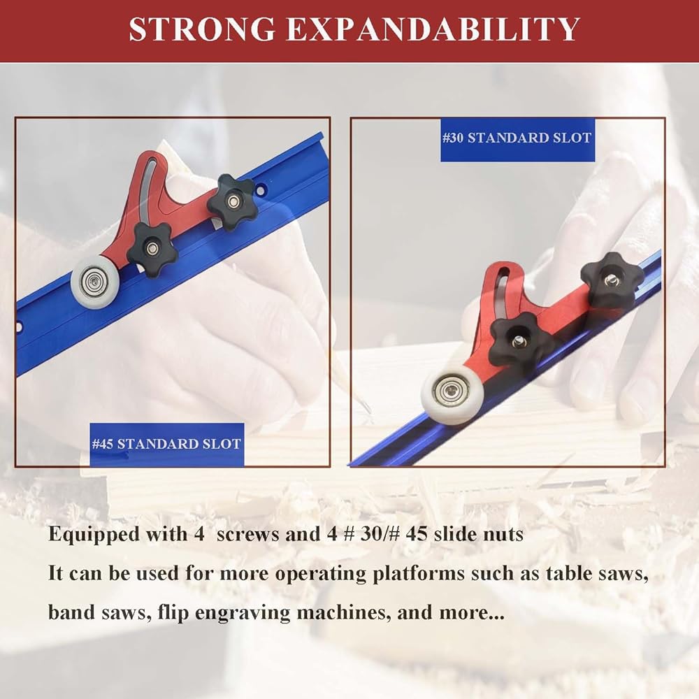 【Expandability】It can be used in the #30 or #45 standard slot, or replaced with small sliders and fixed in the T-slot or on the back of the support. Fit for more consoles such as table saws, band saws, inverted carving machines, etc.