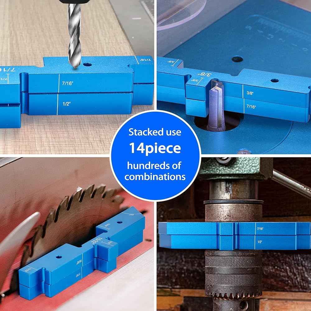 يمكن استخدام مجموعة مكعبات قياس طاولة الراوتر كمقياس ارتفاع ومقياس عمق ومقياس مربع ومقياس زاوية. يمكن استخدام مجموعة قياس ارتفاع كتلة الإعداد الدقيق بشكل فردي أو مكدس. هناك المئات من التركيبات، تلبي احتياجاتك المختلفة.