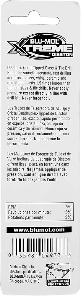 تتميز رؤوس الزجاج والبلاط اكستريم من بلو مول بأطراف كربيد رباعية الرؤوس تعمل على تحسين المتانة والدقة والسرعة فوق رؤوس الزجاج والبلاط القياسية.