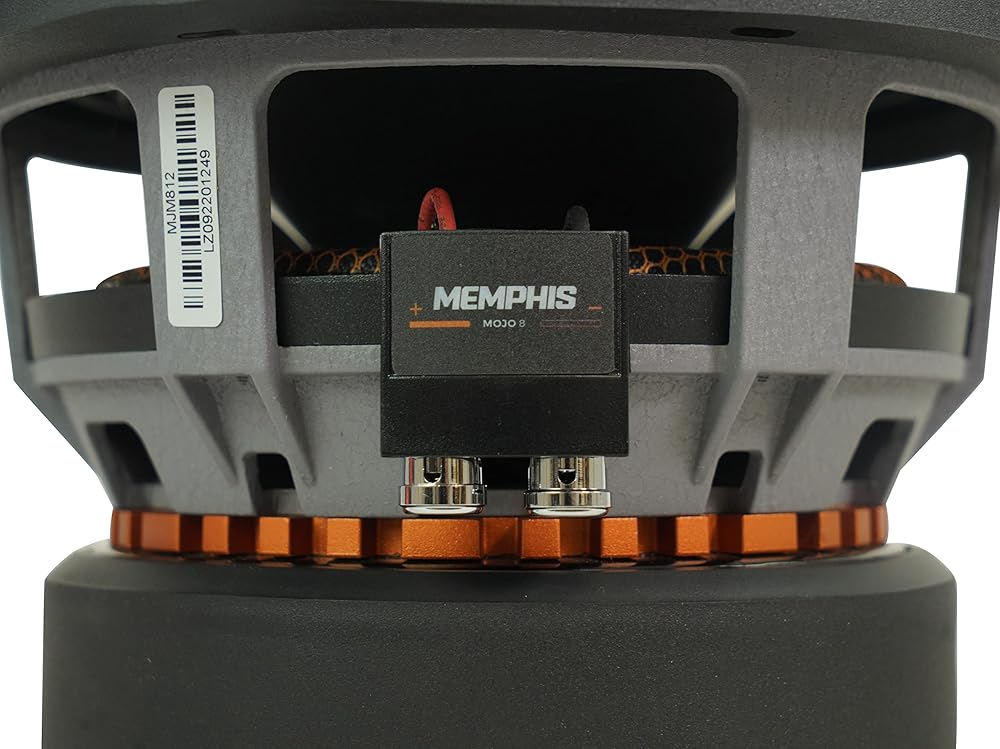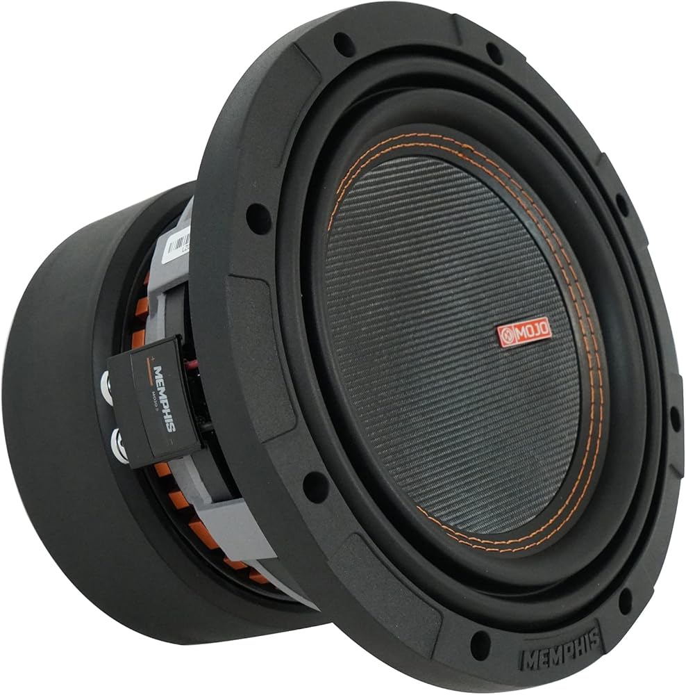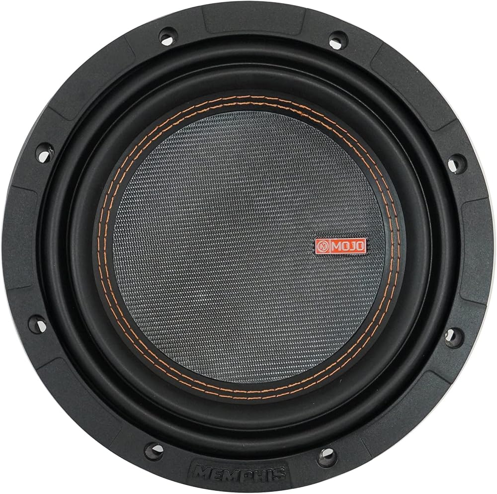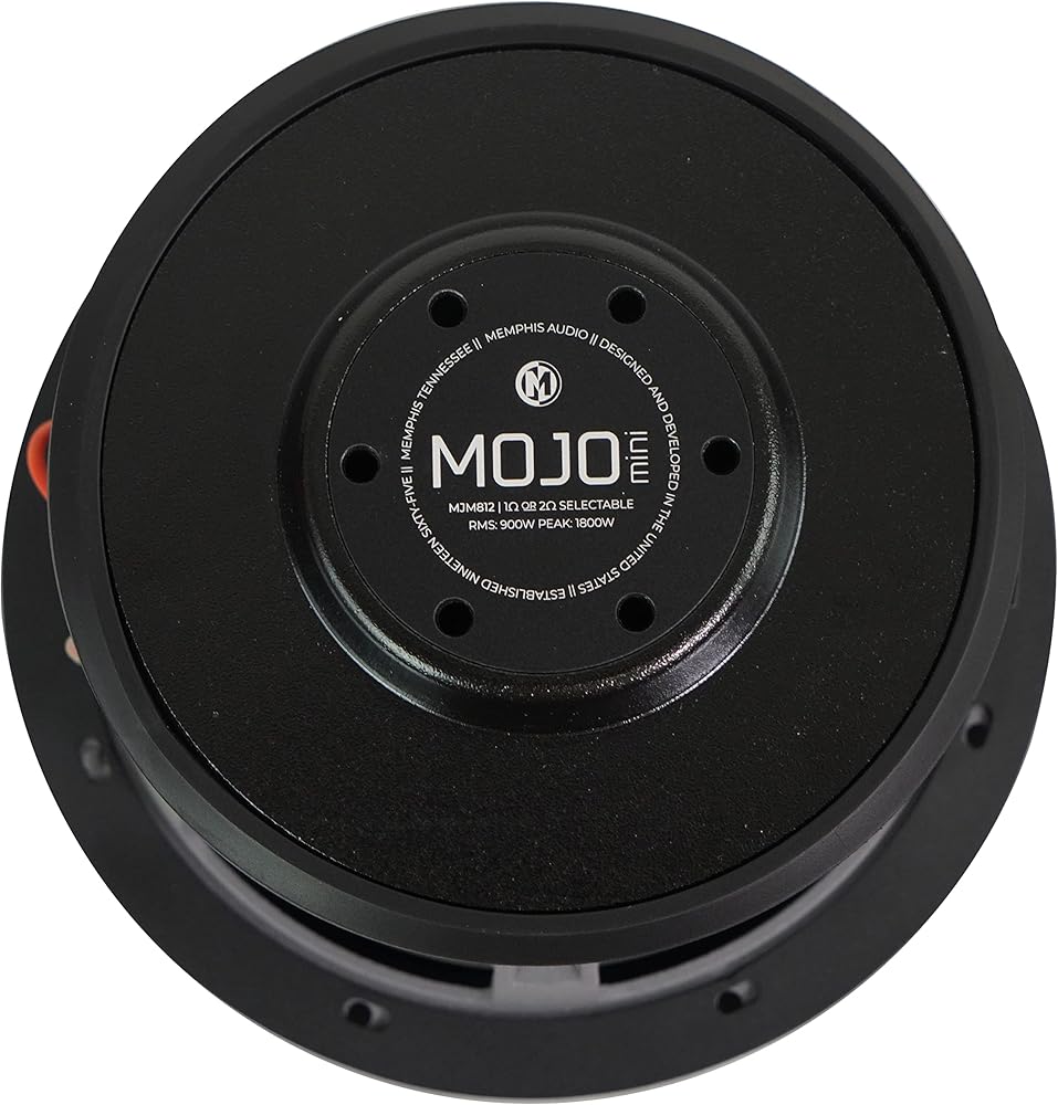 Features: Memphis Audio MOJO MJM812 8" 1800w Competition Car Subwoofer Sub 1 or 2 ohm. 1O or 2O FLEXTM selectable impedance. CCAW triple voice coil (2" on MJM812 & 1.5" on MJM612). Vented cast aluminum basket. Double stitched V-Groove rubber surround. DVVC Direct Vent Voice Coil Cooling. Light weight ultra-rigid glass fiber dustcap. Reinforced spider.