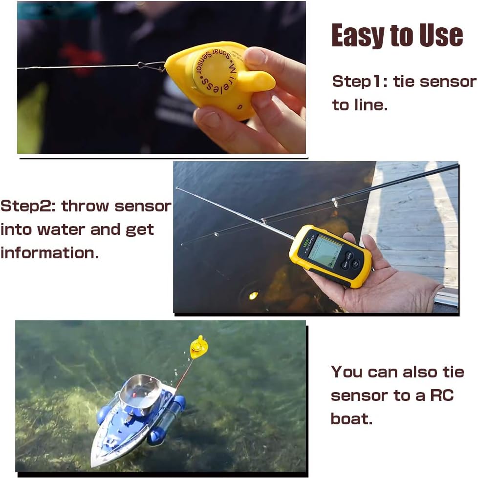 جهاز كشف العمق اللاسلكي: مسافة تشغيل جهاز كشف السمك اللاسلكي 393 قدمًا (120 مترًا). بالمقارنة مع غيره من أدوات الصيد المحمولة، فإنها تمنحك نطاقًا أكبر لصيد السمك. وفي الوقت نفسه، سيتم إيقاف التشغيل عندما تتجاوز مسافة التشغيل 460 قدم سونار محول كاياك إلى الخط أو القضيب، ثم قم بإدخاله في الماء قدر الإمكان. سيعمل محول السونار الثلجي تلقائيًا بمجرد ملامسته للماء.