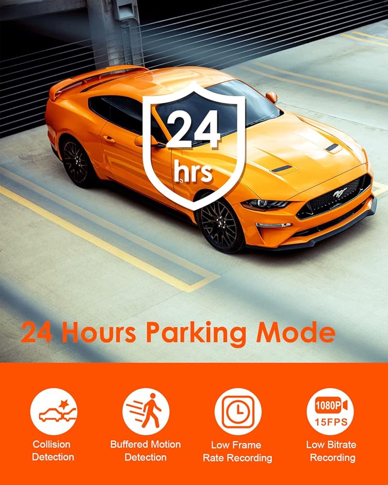 وضع ركن السيارة لمدة 24 ساعة: سيتم التبديل تلقائيًا إلى وضع ركن السيارة أثناء ركن سيارتك. يمكن تشغيل اكتشاف الاصطدام أو اكتشاف الحركة المخزنة عن طريق التأثير أو الحركة، ويستمر وضع معدل البت المنخفض أو معدل الإطارات المنخفض في التسجيل بشكل مستمر مع استهلاك منخفض للطاقة. إذا كانت سيارتك متورطة في حادث اصطدام وهرب أثناء ركنها، أو حاول شخص ما سرقة سيارتك، فإن كاميرا لوحة القيادة هذه ستوفر حماية على مدار الساعة لراحة البال القصوى مع 4 أنواع من أوضاع ركن السيارة.