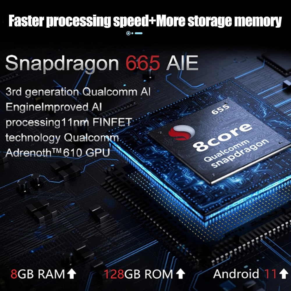 وحدة المعالجة المركزية القوية: نظام تشغيل Snapdragon 665AIE Android 11.0 النقي مع تشغيل لاسلكي وAndroid auto، وذاكرة الوصول العشوائي (RAM) سعة 8 جيجابايت + ذاكرة الوصول العشوائي (ROM) سعة 128 جيجابايت، و8 نوى، و9 معادلات للصوت 4*45 وات EQ، وAM / FM مع شريحة راديو RDS NXP6686.