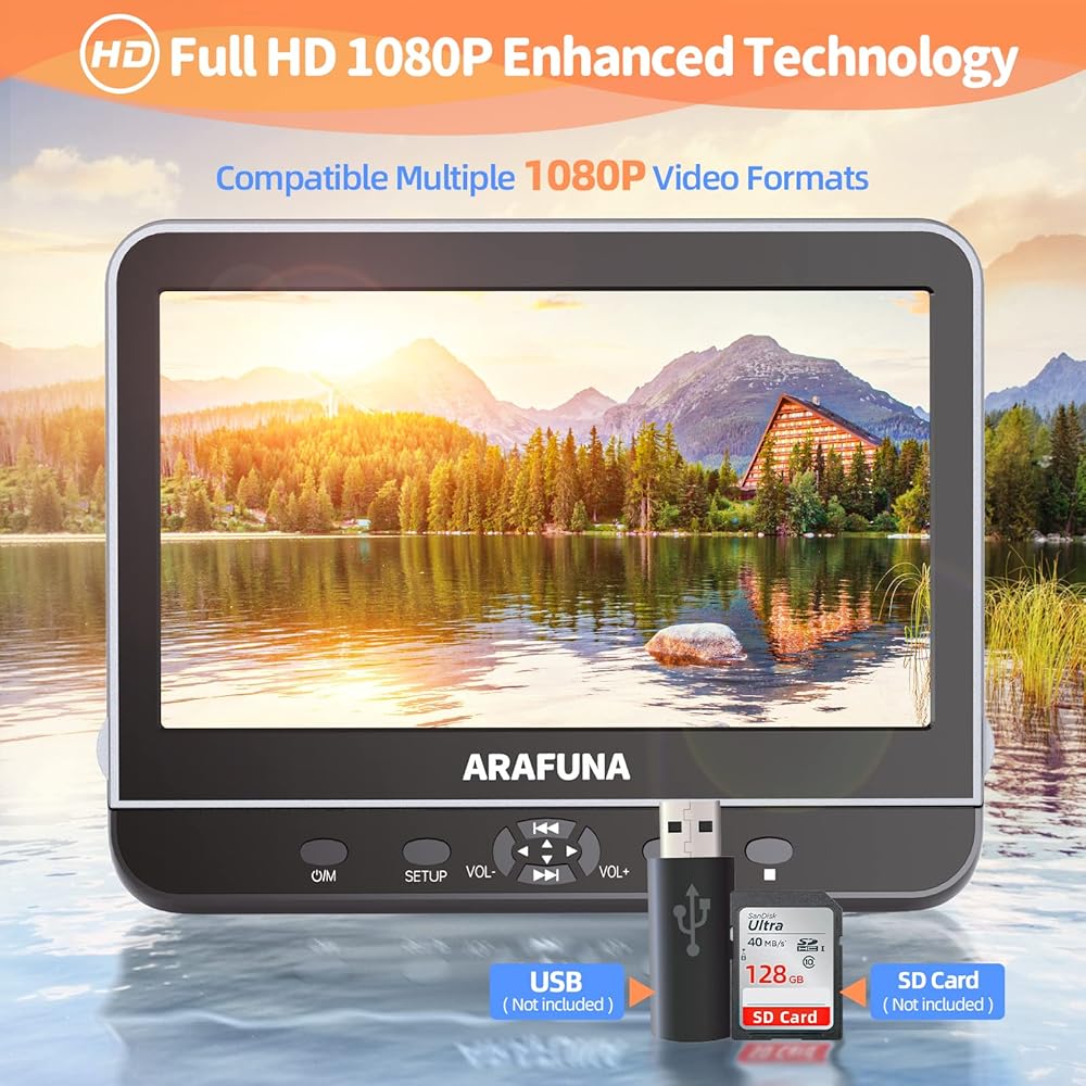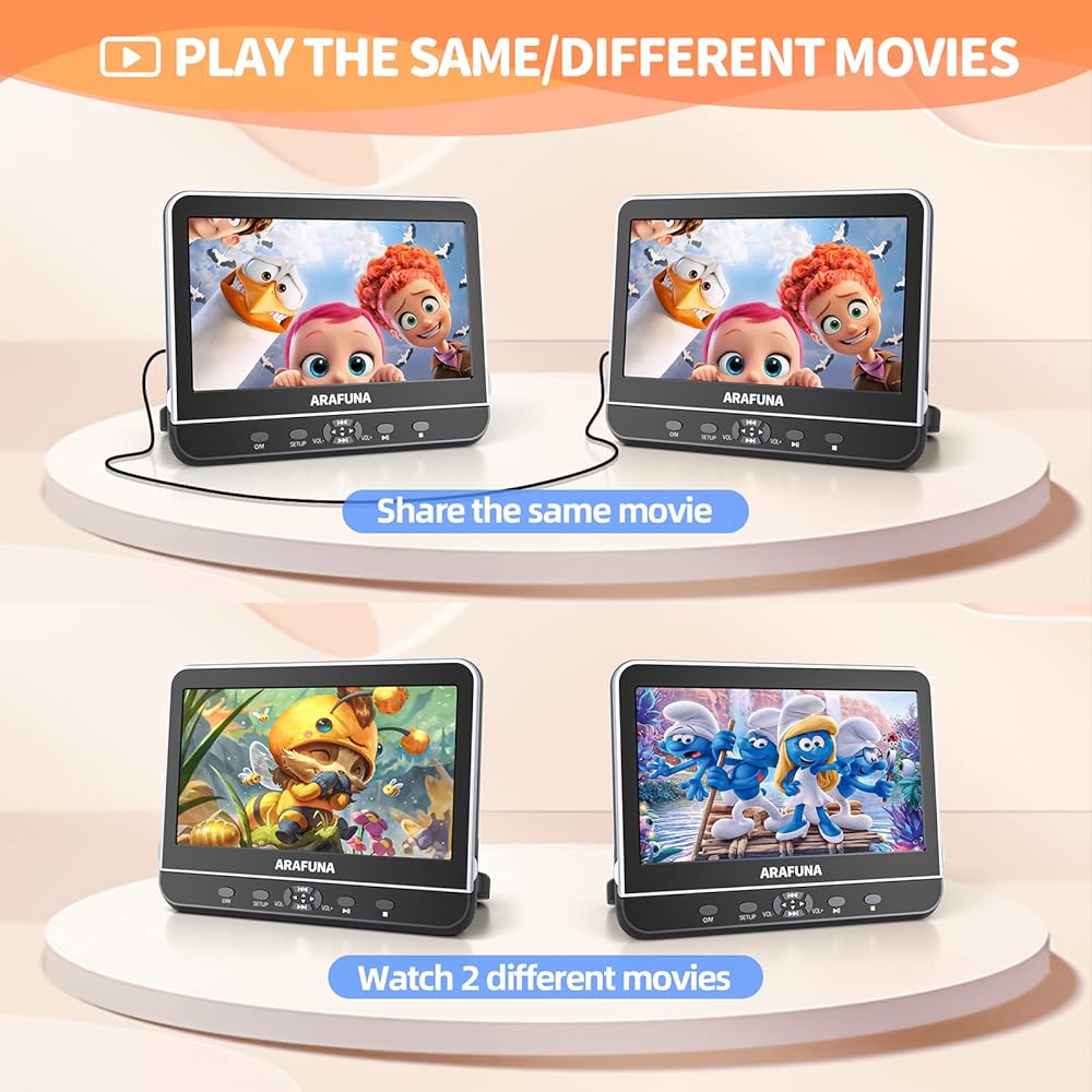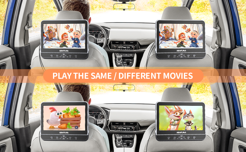 مشغل دي في دي مزدوج محمول 10.5 انش مع مدخل HDMI، مشغل دي في دي ارافونا للسيارة بشاشة مزدوجة لتشغيل نفس او فيلمين مختلفين، مشغل دي في دي لمسند الراس يدعم فيديو HD 1080P ومنفذ USB/SD، ذاكرة اخر