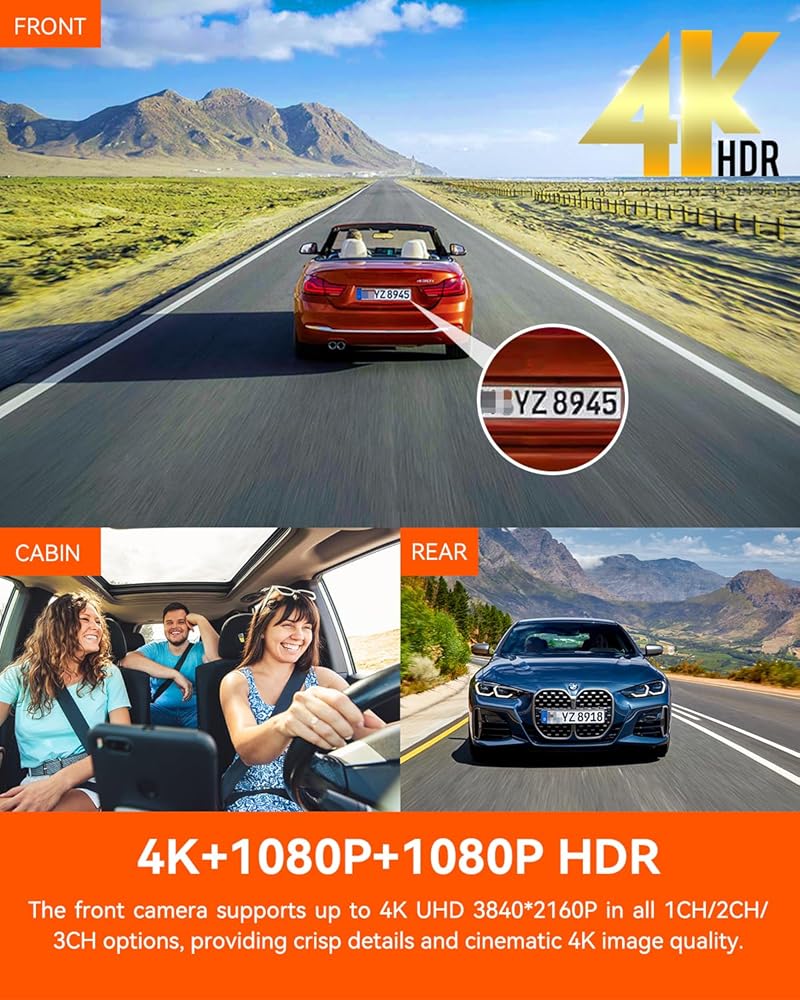 [ SONY STARVIS 2 True 4K Triple Dash Cam ] باستخدام أحدث مستشعر SONY STARVIS 2 IMX678 لعام 2023، تدعم الكاميرا الأمامية N4 Pro دقة تصل إلى 4K 3840*2160 في جميع خيارات 1CH/2CH/3CH. يوفر جودة صورة سينمائية وسلسة بدقة 4K، مما يجعل قراءة لوحات الترخيص أمرًا سهلاً، ليلاً أو نهارًا. راقب الجزء الأمامي والداخلي والخلفي من سيارتك في وقت واحد بدقة 4K+1080P+1080P، مما يوفر أدلة قيمة لمطالبات التأمين أو النزاعات.