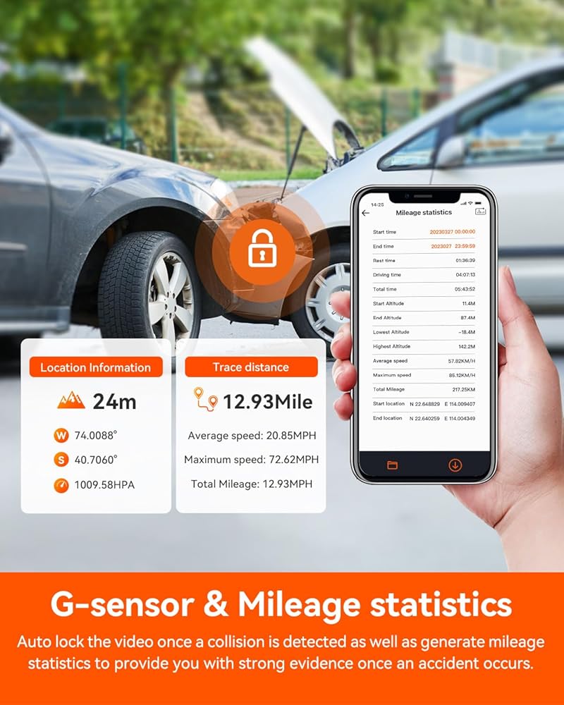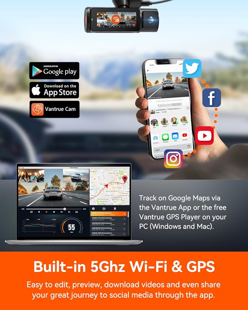 [تحديث البرامج الثابتة عبر الهواء وشبكة Wi-Fi أسرع بسرعة 5 جيجا هرتز ونظام تحديد المواقع] يدعم ترقيات البرامج الثابتة عبر الهواء على التطبيق لتحسين الأداء والميزات المحدثة. مع شبكة Wi-Fi 5 جيجا هرتز التي تعمل دائمًا، يمكنك الوصول بسهولة إلى مقاطع الفيديو والصور المسجلة على هاتفك من خلال تطبيق "Vantrue"، ومشاركة مشهد السفر ولحظاتك مع عائلتك وأصدقائك على وسائل التواصل الاجتماعي. يتيح لك نظام تحديد المواقع العالمي (GPS) المدمج عرض مسار القيادة والموقع الخاص بك على التطبيق، ويمكن تضمين ختم السرعة في الفيديو، مما سيوفر أدلة إضافية قد تحتاجها.