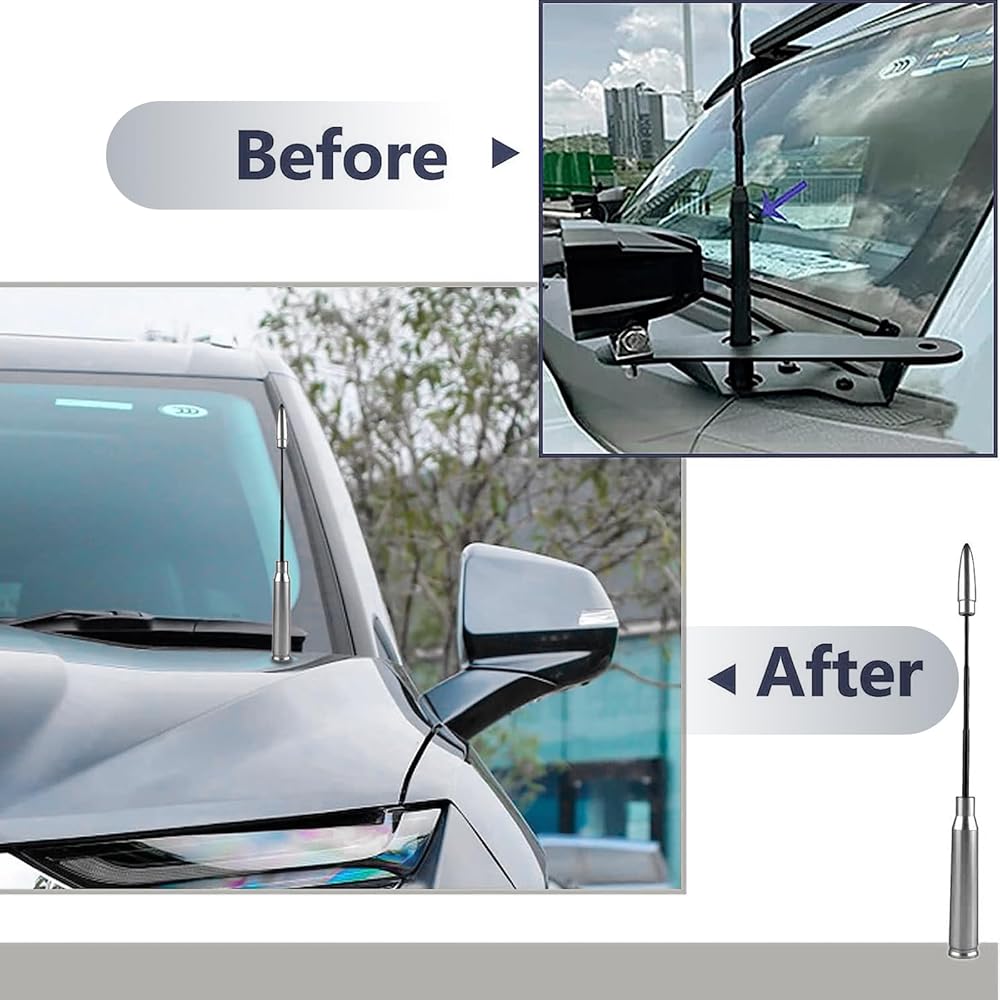 • تصميم عالي الجودة: إشارة هوائي الرصاصة مستقرة ولها أداء ممتاز في استقبال الإشارة. يمكنك الاستمتاع تمامًا بمحطة الراديو المفضلة لديك. لا تقلق بشأن الضوضاء والعالق والظواهر الأخرى. بعد استخدام الاتصال، لا يؤثر ذلك على البلوتوث ونظام تحديد المواقع. التعديلات والتعديلات الشخصية مليئة بالملمس المعدني الفني، وليس من السهل إجراء عملية الكشط.