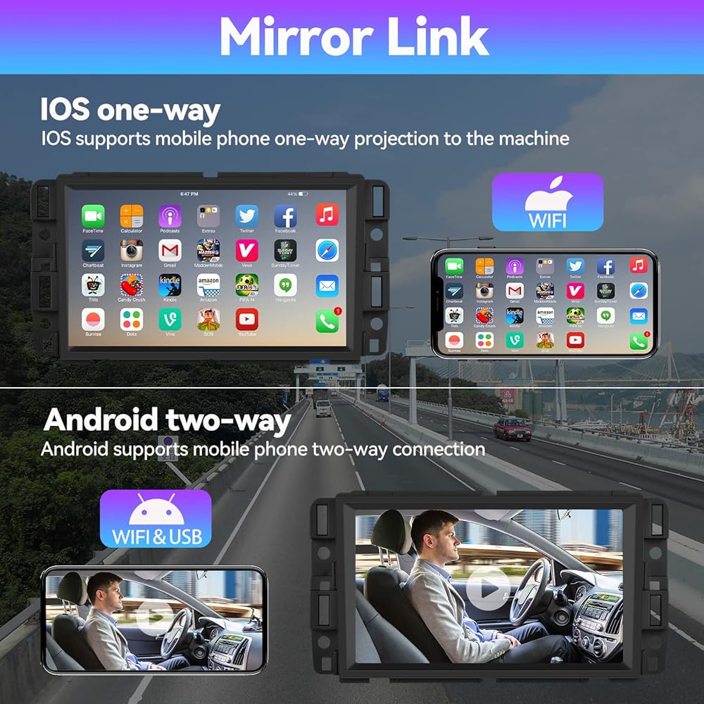 Mirror Link For Android & IOS Connecting via original USB data cable, you can mirror the phone APPs to the car radio screen. IOS phones support one-way control, android devices supports two-way control. Phone screen mirroring function for map, music, 1080p video or games. (not for Samsung)