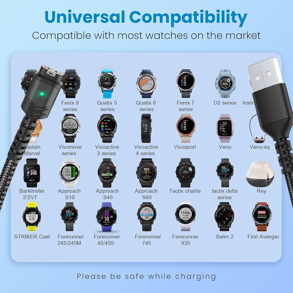 متين وموثوق: كابل شاحن ساعة Garmin الخاص بنا مصنوع من مواد عالية الجودة، مما يضمن عمرًا طويلًا ومقاومة للكسر. لا تقلق أبدًا بشأن تلف كابل الشاحن الخاص بك أو أن يصبح غير موثوق به.