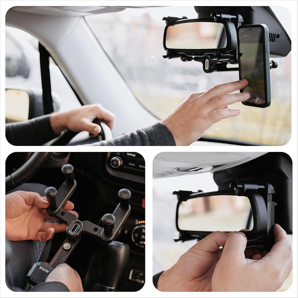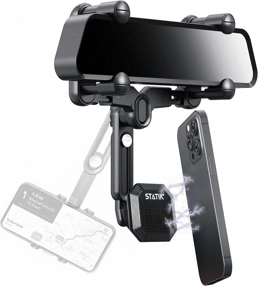 حامل هاتف بمرآة الرؤية الخلفية للسيارة مغناطيسي من Statik | القيادة على مستوى العين | دوران 360 درجة قابل للسحب وقابل للتعديل | مغناطيس تثبيت الهاتف على مرآة الرؤية الخلفية القوية
