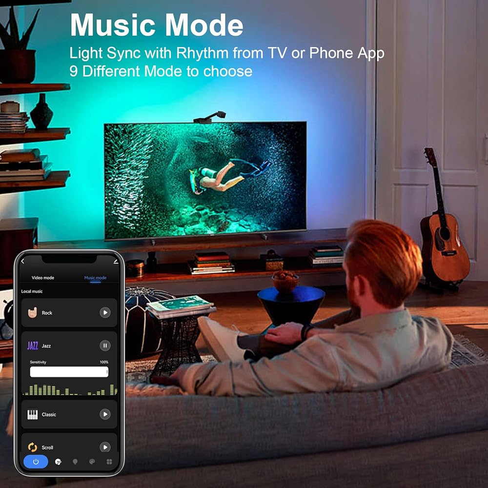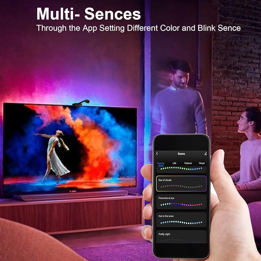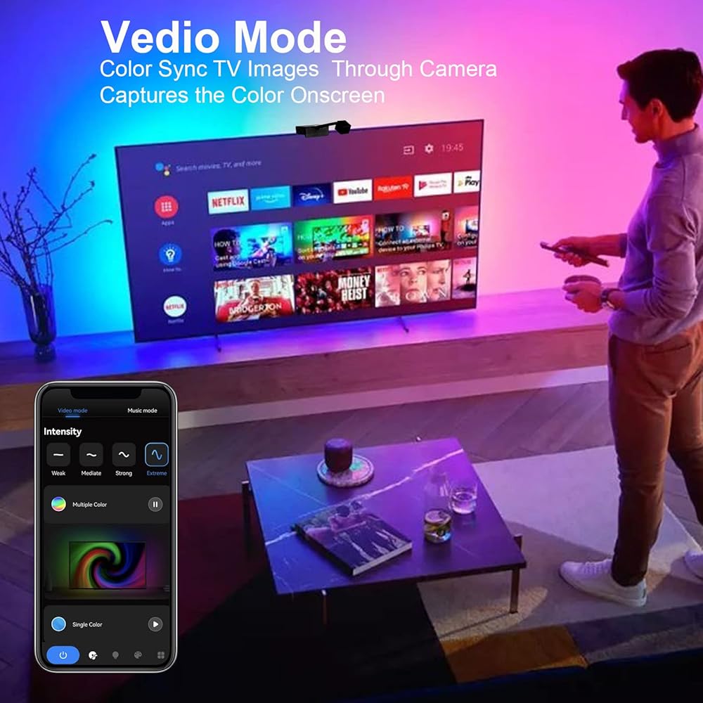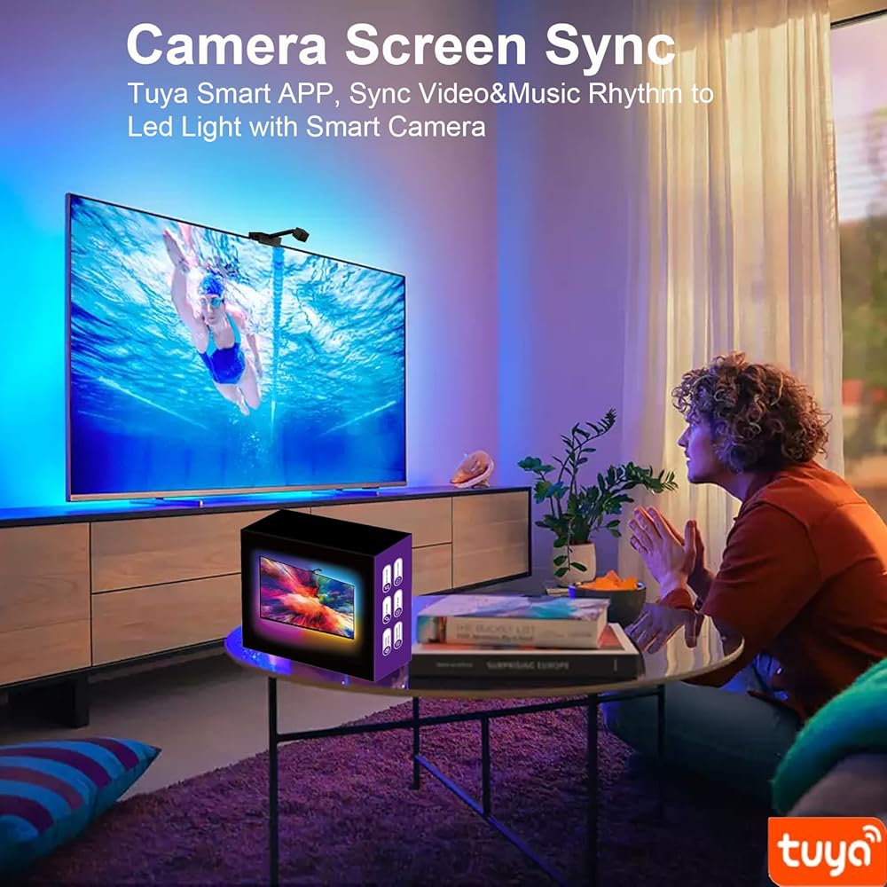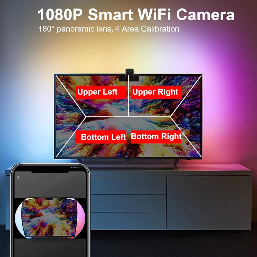 إضاءة خلفية LED للتلفزيون مع كاميرا، وحدة تحكم مزامنة شاشة كاميرا واي فاي 1080P مع تطبيق الهاتف، مصابيح LED RGBIC للتلفزيون مع الفيديو، إيقاع الموسيقى، وضع المشهد، شريط أضواء LED بطول 16.4 قدم لأجهزة التلفزيون مقاس 55-70 بوصة