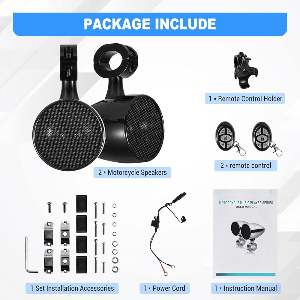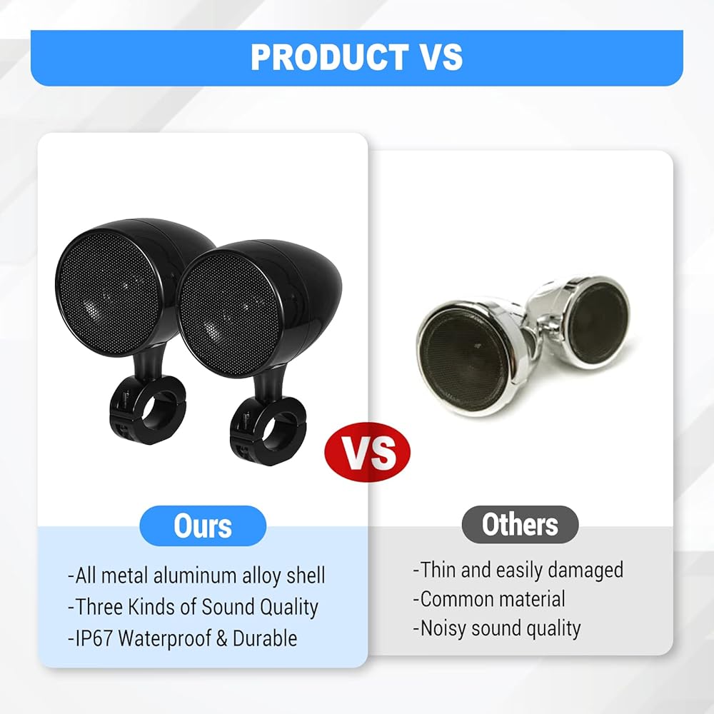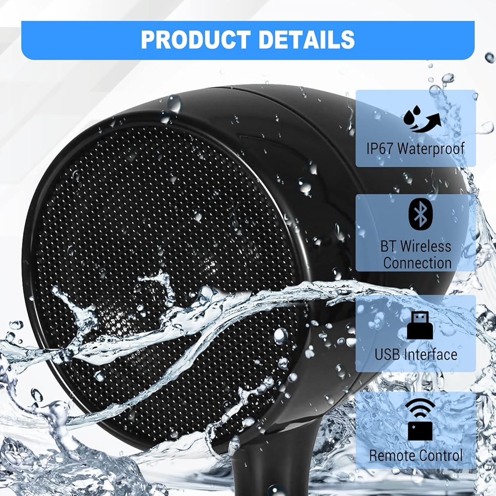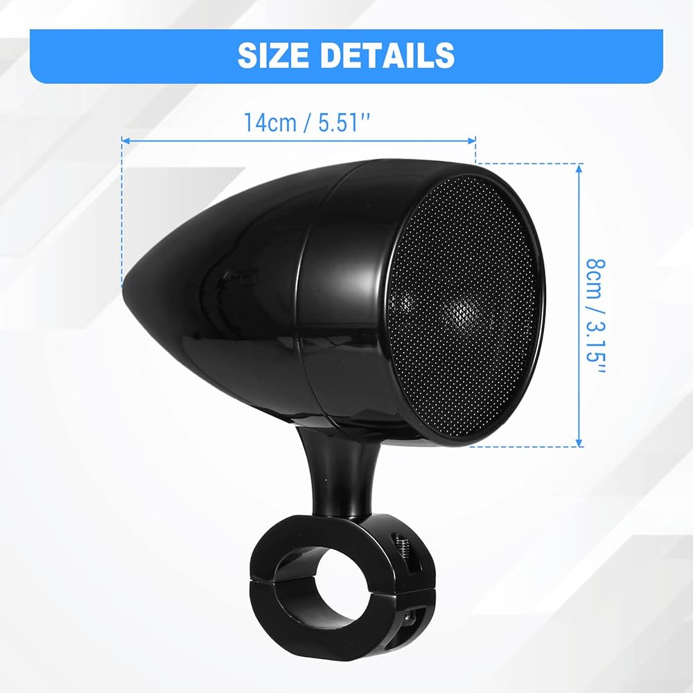 【IP65 مقاوم للماء】مكبر صوت الدراجة النارية OXMART مقاوم للماء ومتين للاستخدام، مصنوع من هيكل معدني من سبائك الألومنيوم، لذلك يمكن أن يكون مضادًا للماء والرطوبة ومضادًا للضباب من معظم البيئات. لا يقاطع الاستمتاع بالموسيقى في أي وقت.
