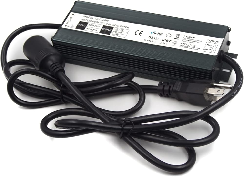 محول الطاقة المقاوم للماء للسيارة مناسب لمعظم المنتجات الإلكترونية للسيارات في حدود 120 وات، مثل ثلاجة السيارة، ومبرد سخان السيارة، ومنفاخ إطارات السيارة، ومكنسة كهربائية للسيارة، ووسادة تدليك السيارة، وسخان المياه المحمول للسيارة، ومنقي هواء السيارة، ومسجل فيديو DVR للسيارة، جهاز إرسال FM بلوتوث للسيارة، مرطب السيارة، إلخ.