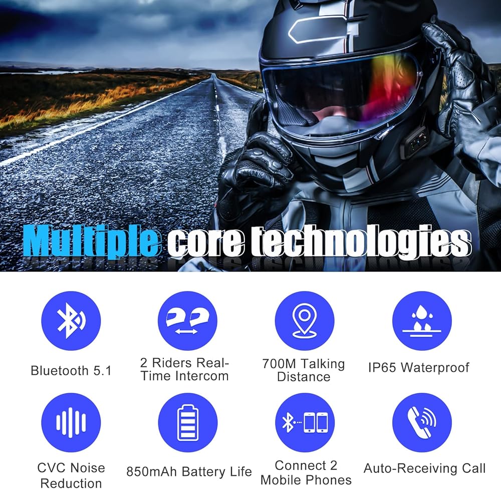 [قم بتوصيل هاتفين محمولين]: باستخدام رقاقة كوالكوم بلوتوث 5.1، يمكن لسماعة الرأس بلوتوث في 7 للدراجات النارية توصيل هاتفين محمولين في نفس الوقت، حتى لا يفوت مستخدمو الأجهزة المتعددة أي مكالمة. كما أنه يحتوي على وظائف المساعد الصوتي والرد التلقائي على المكالمات لمدة 5 ثوانٍ، مما يجعل رحلة الركوب أكثر أمانًا وراحة.
