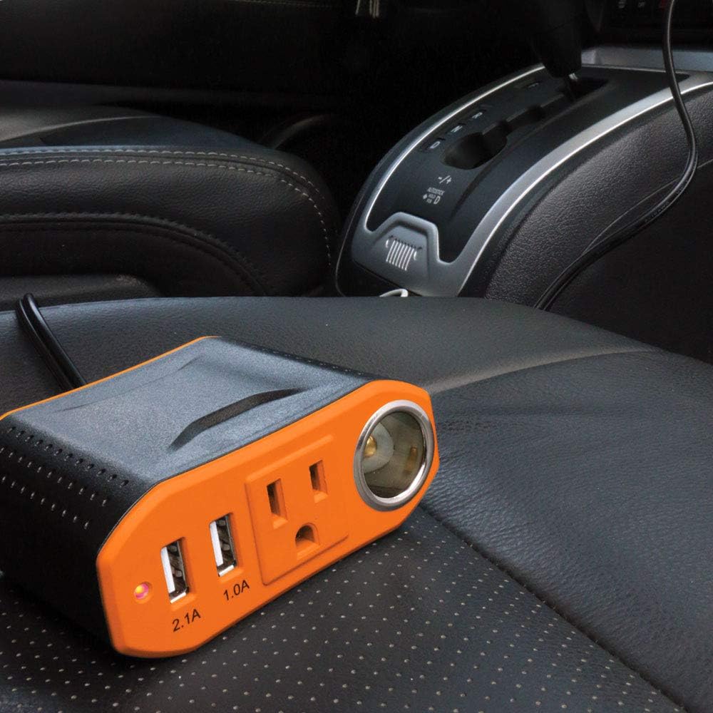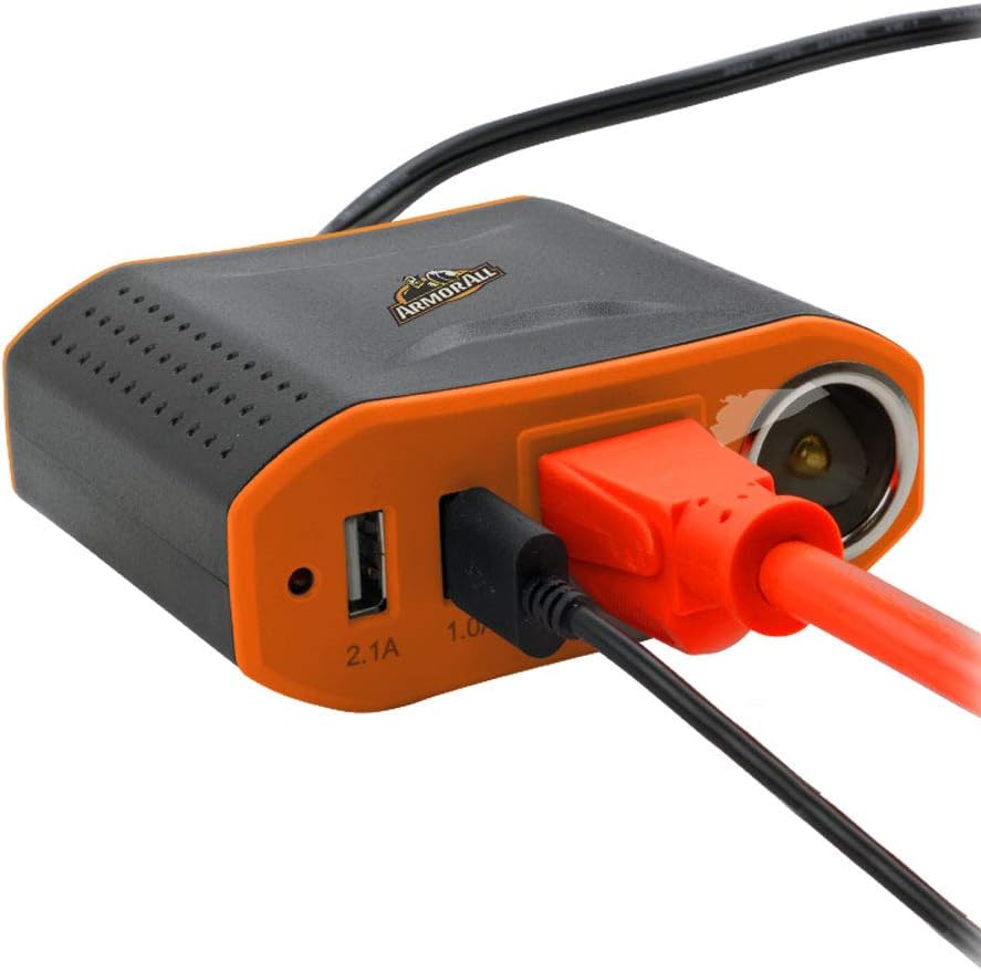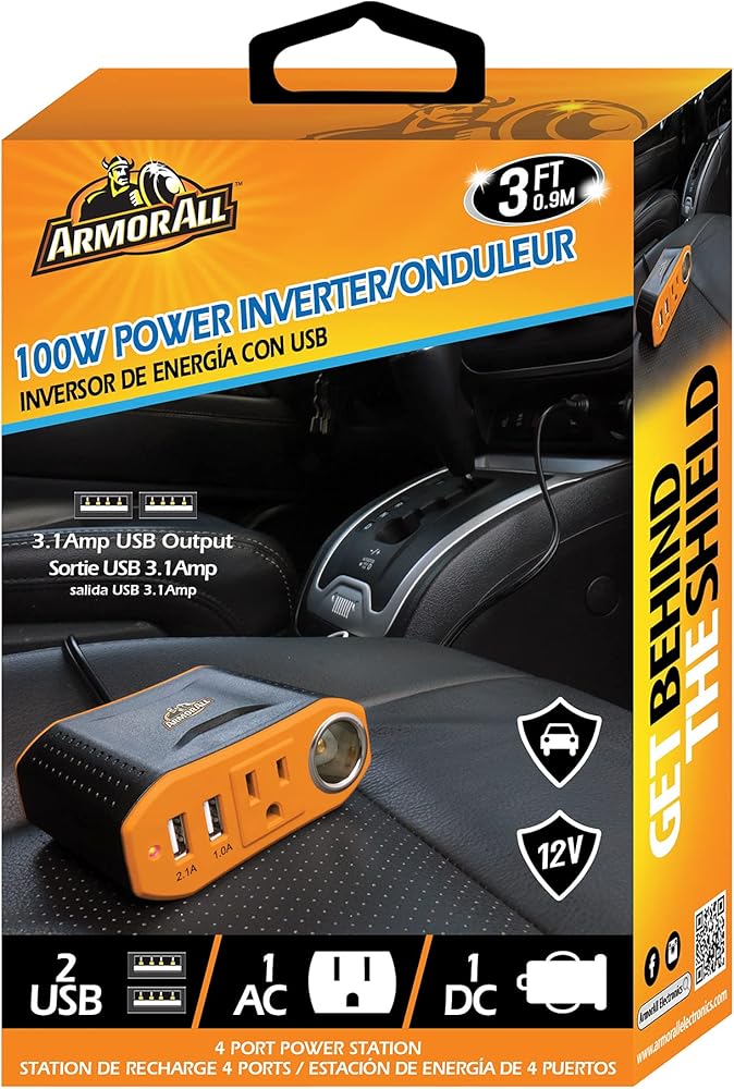 احصل على خلف الدرع مع محول طاقة 100 واط من ArmorAll يتم توصيله مباشرة بمنفذ تيار مستمر في سيارتك ويسمح لك باستخدام العناصر التي تتطلب محول تيار متردد. كما أنه يوفر منفذ تيار مستمر بحيث يمكنك استخدام شاحن سيارة أو منتج تيار مستمر آخر. يتميز محول الطاقة هذا أيضًا بمنفذي USB لشحن كابلات الشحن لشحن أجهزتك بسهولة في نفس الوقت.