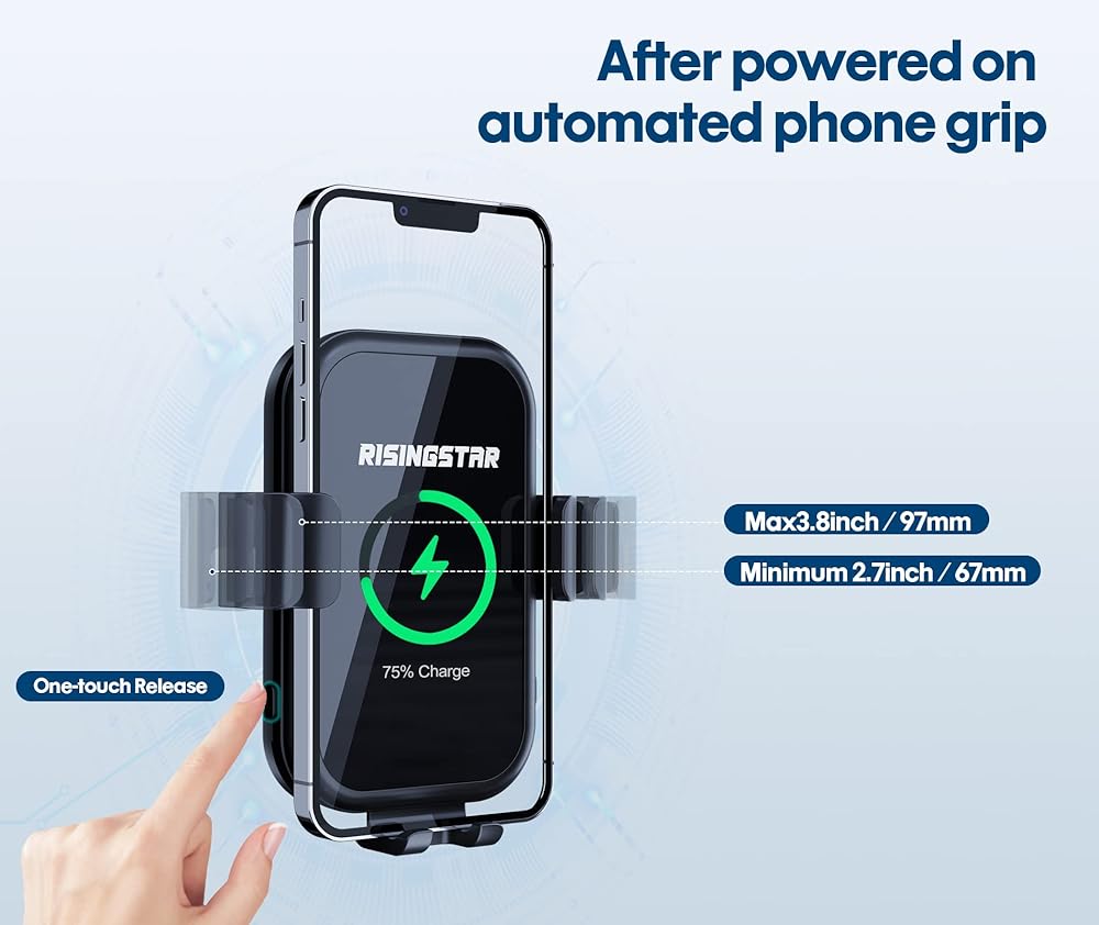 【محاذاة دقيقة تلقائية】شاحن الهاتف اللاسلكي للسيارة هذا هو مستشعر متقدم مدمج، فقط ضع هاتفك في بعد الطاقة، وسيقوم بتحديد هاتفك وتعديله تلقائيًا بأفضل مساحة شحن وفقًا لطراز هاتفك، فلا حاجة إلى ضبط القدم يدوياً.