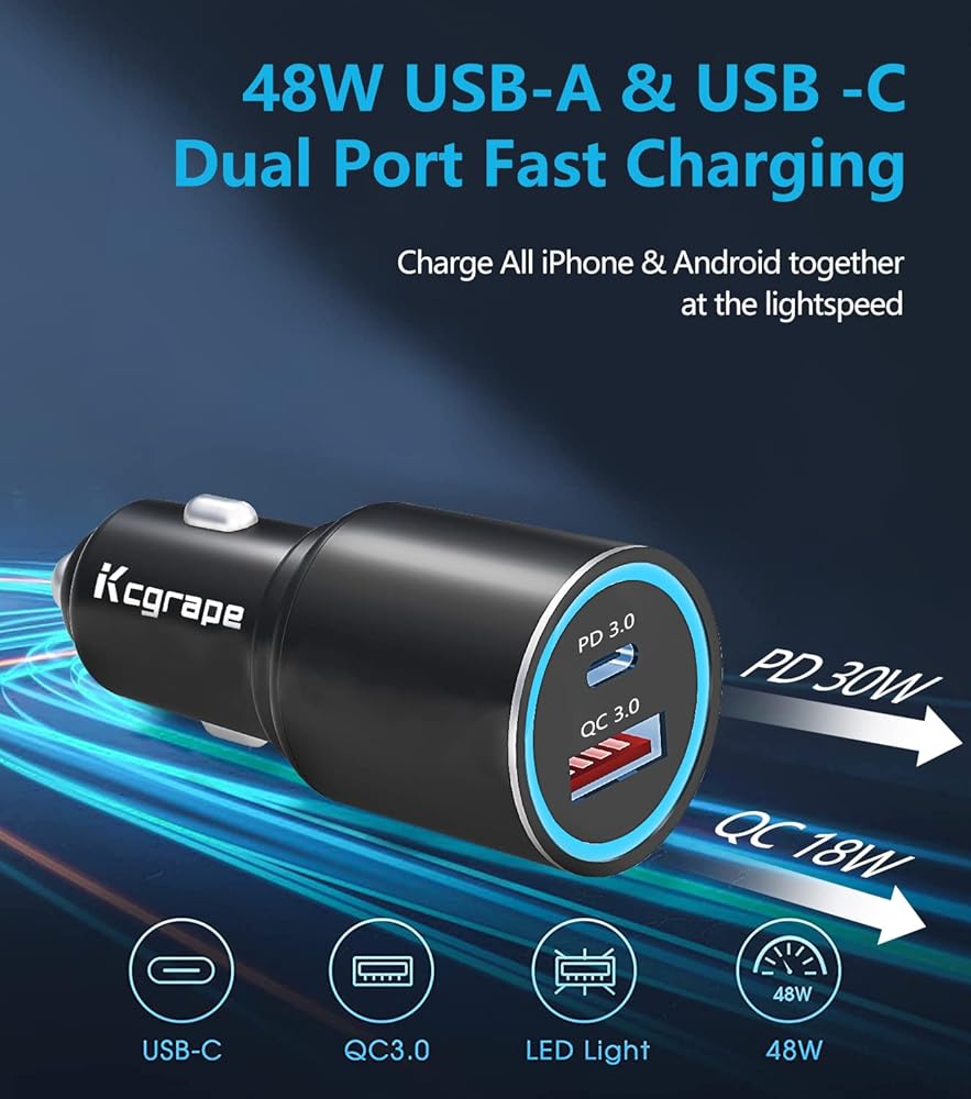 【سهلة الاستخدام】: تقنية التكيف الذكي IC الذكية: تحدد جهازك المحمول لتوفير أسرع شحن ممكن تلقائيًا. شاحن هاتف السيارة Kcgrape يشحن جهازين في وقت واحد بسرعة عالية. ملحقات السيارة. ضوء LED أزرق ناعم وتصميم متعدد الحلقات، يرشدك إلى العثور على منافذ الشحن في الظلام بسهولة. غلاف من سبائك الألومنيوم - السفع الرملي المؤكسد، مقاوم للخدش وتبديد الحرارة بشكل فعال