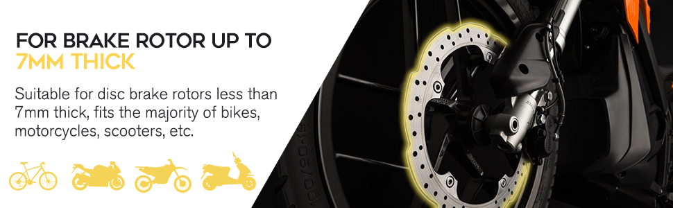 للدوارات بسُمك 7 مم أو أقل: يناسب معظم الدراجات النارية والدراجات ذات فرامل قرصية، حيث يكون سُمك دوار الفرامل أقل من 7 مم (1/4 بوصة) ومثقوب بشكل متقاطع. جهاز أمان نشط مثالي لمعظم الموديلات الشائعة: هارلي ديفيدسون، Yamaha FJR / Raptor 700، 2017 Honda Grom، 2017 Kawasaki Z125 / Kawasaki Ninja 250r 500r 650 2017 2012، 2016 Indian Scout Sixty، Triumph Bonneville Streetsmat، Victory CrossCountry، Honda Shadow Spirit، إلخ.