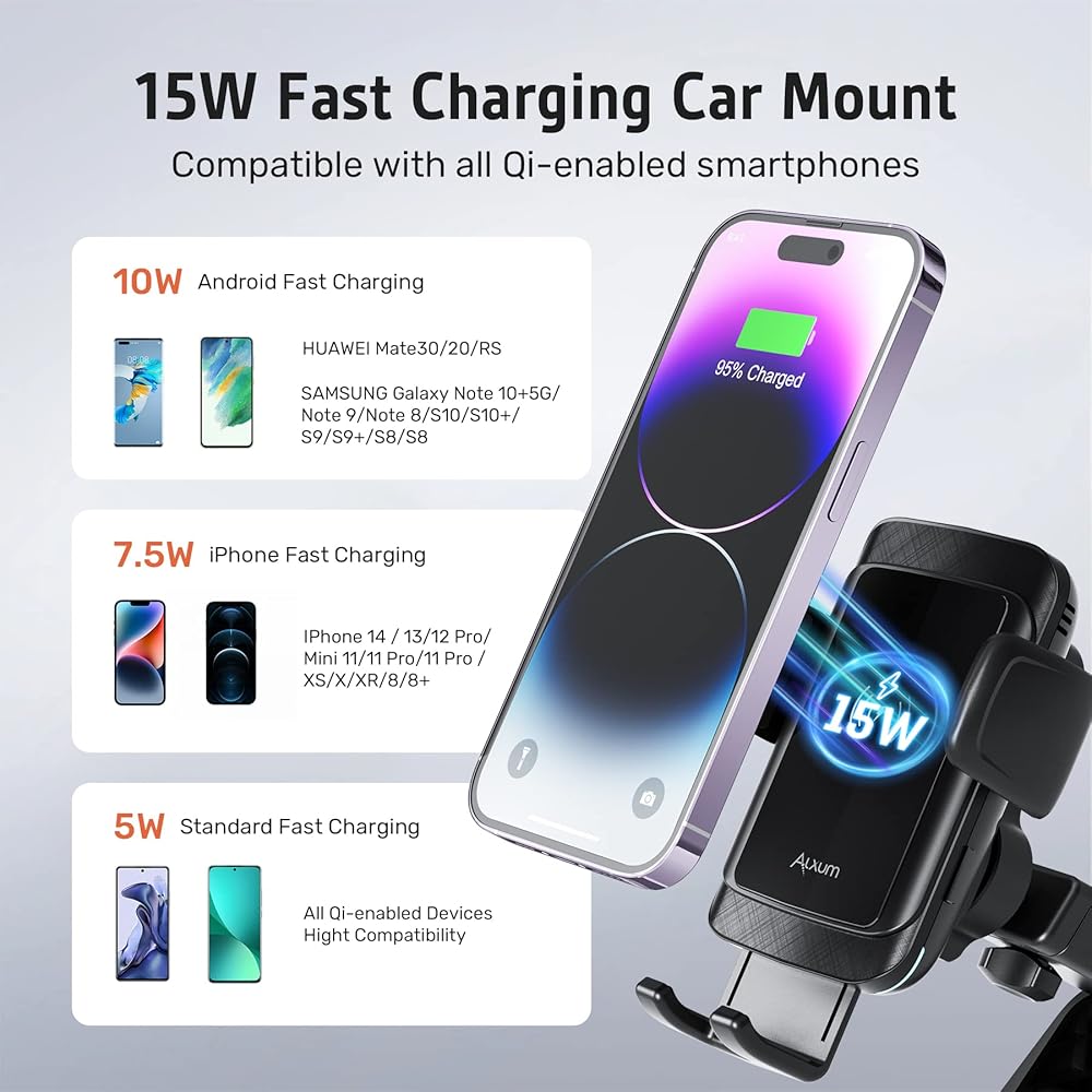 شحن لاسلكي سريع كيو اي بقدرة 15 واط - يعتمد شاحن السيارة اللاسلكي الكسوم على ملف مستقل مطور بكفاءة شحن عالية الجودة، كما أنه معتمد من UKCA(BSTXD220121266601EC)، CE(CQASZ20220500921E)، شهادة كيو اي التي يمكن أن تدعم جميع الهواتف التي تدعم تقنية كيو اي. أقصى طاقة شحن أكثر أمانًا وسرعة وفقًا لهاتفك حتى 15 واط.