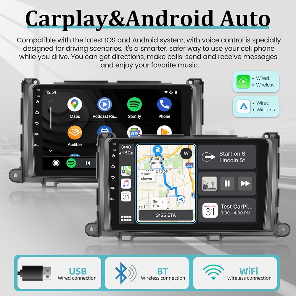 【Carplay اللاسلكي وAndroid Auto】- تحتوي وحدة رأس Toyota Sienna على Apple CarPlay وAndroid Auto لاسلكي/سلكي، والتي يمكن أن تدعم أحدث أنظمة IOS وAndroid. من المناسب لك دمج هاتفك الذكي عبر وظيفة CarPlay اللاسلكية/السلكية أو Android Auto، مما يسمح لك بإجراء مكالمات هاتفية والوصول إلى التنقل عبر الخرائط وما إلى ذلك.