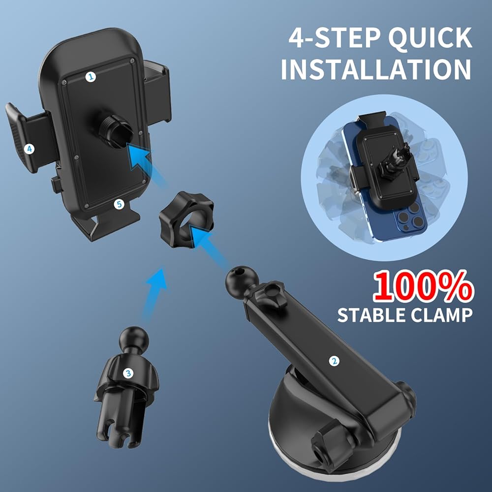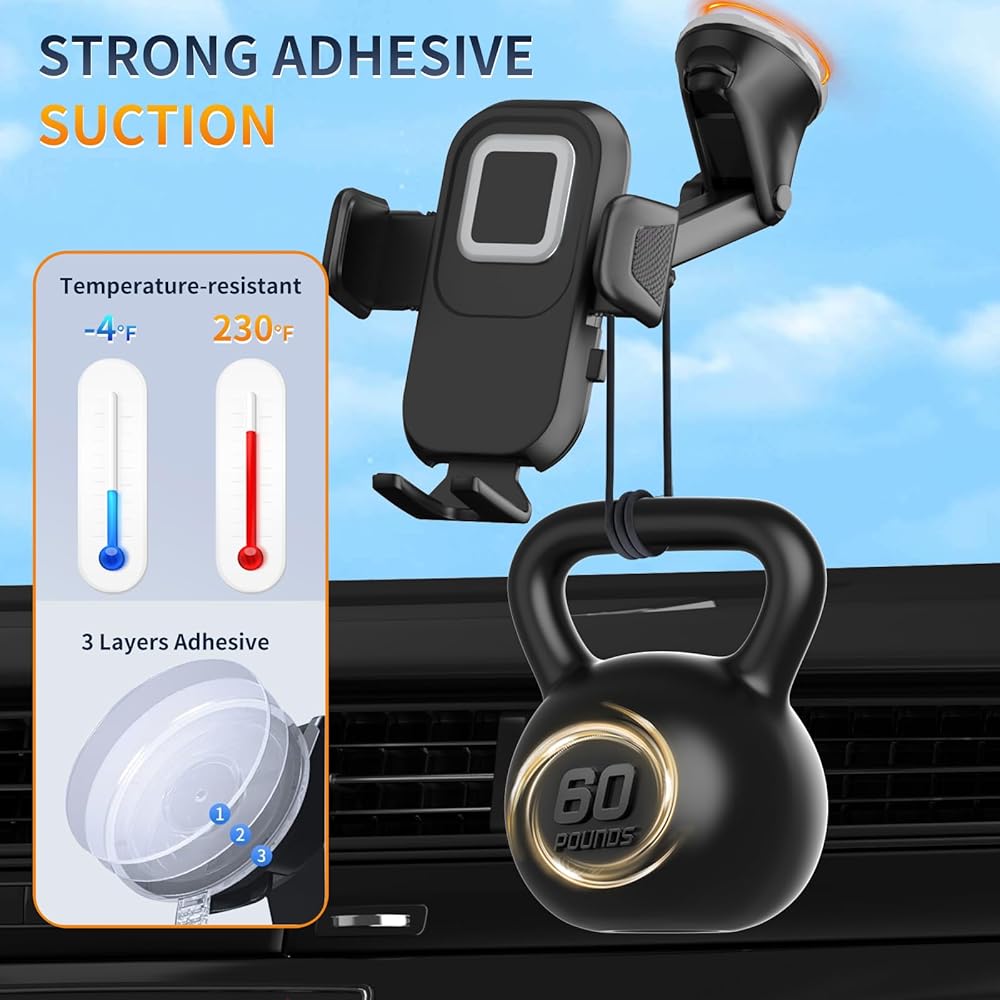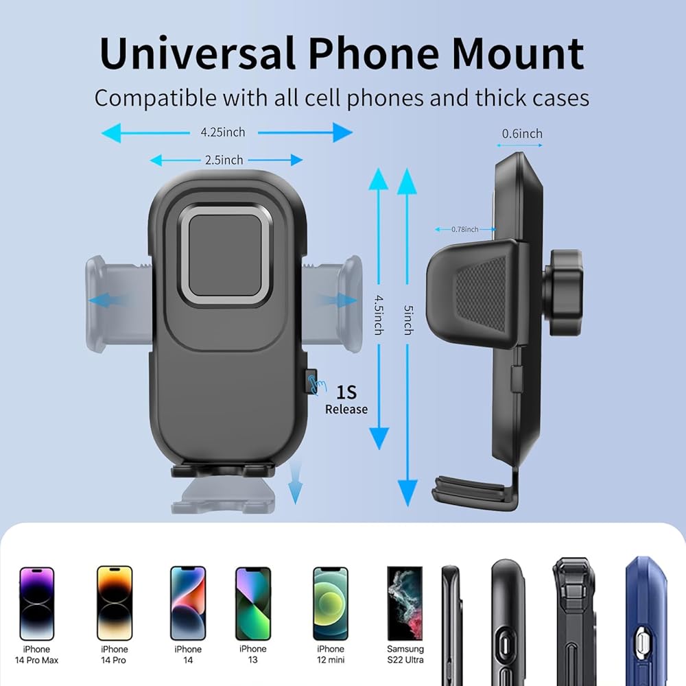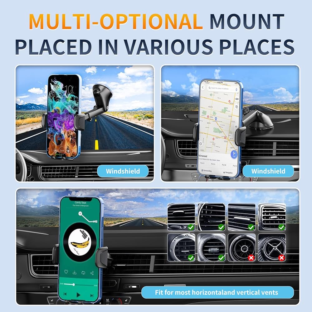 [حامل هاتف متعدد الوظائف 4 في 1، أفضل رفيق في أي مكان] حامل هاتف السيارة مزود بكوب الشفط ومشبك فتحة تهوية الهواء، مثبت بإحكام على فتحة تهوية سيارتك ولوحة القيادة والزجاج الأمامي وحتى حوض الاستحمام أو المكتب. علاوة على ذلك، ينطبق حامل السيارة لجهاز iPhone على معظم السيارات والشاحنات الصغيرة وسيارات الدفع الرباعي والشاحنات وسيارات الأجرة؛ مساعد جيد لسائقي Uber وLyft.