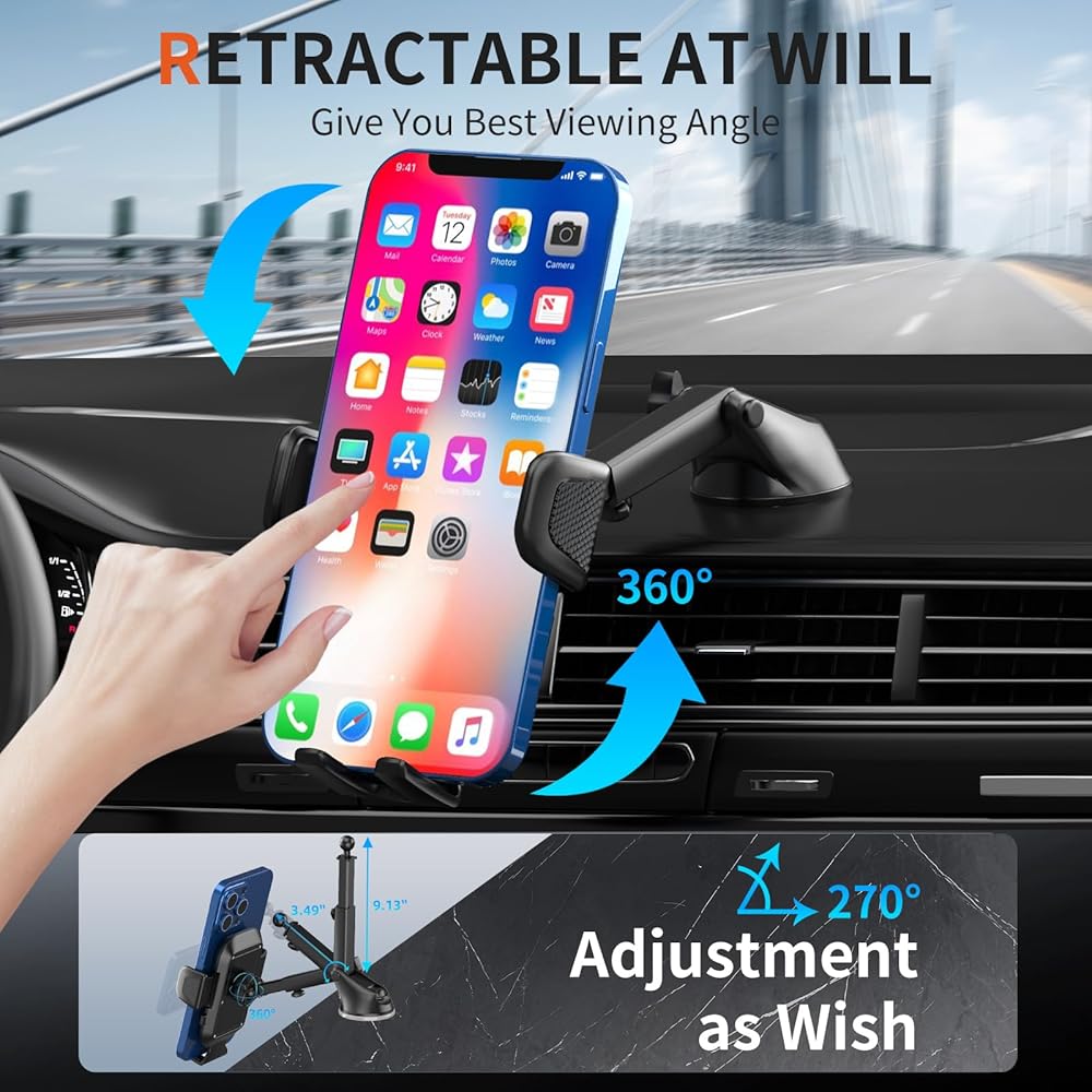 [ذراع تلسكوبي مرن] يتميز حامل هاتف السيارة بذراع تلسكوبي محسن يمكن تعديله من 4.5 بوصة إلى 9.2 بوصة لزوايا رؤية مختلفة. كما يتميز حامل الهاتف بكرة دوارة بزاوية 360 درجة لمزيد من الراحة وتجربة قيادة أكثر أمانًا
