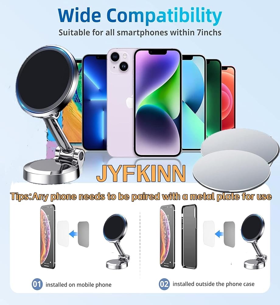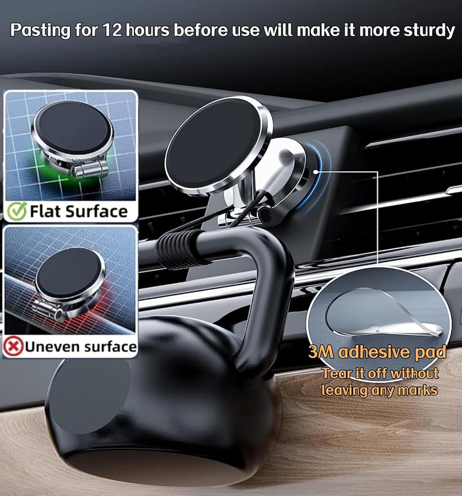 [توافق واسع] حامل مغناطيسي للسطح المنحني متوافق مع جميع الهواتف، حامل هاتف السيارة المغناطيسي القابل للطي مناسب لسطح المكتب والمكتب والسيارة. قبل استخدام حامل هاتف السيارة المغناطيسي هذا، يرجى الانتظار لمدة 12 ساعة بعد التثبيت لضمان الشفط المناسب. للحصول على أقصى قدر من القوة المغناطيسية، تأكد من استخدام اللوحة المعدنية المرفقة مع الحامل.
