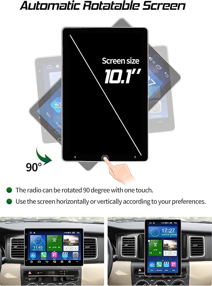 • 🚗【شاشة HD مقاس 10.1 انش】شاشة لمس سعوية عالية الجودة قابلة للدوران مقاس 10.1 انش، شاشة أوتوماتيكية بدوران 90 درجة، زاوية عرض قابلة للتعديل، زاوية رأسية أو أفقية بمفردك مع زر للتحكم. دقة عالية، الشاشة أكبر وأكثر وضوحاً، مما يمنحك تجربة بصرية رائعة.
